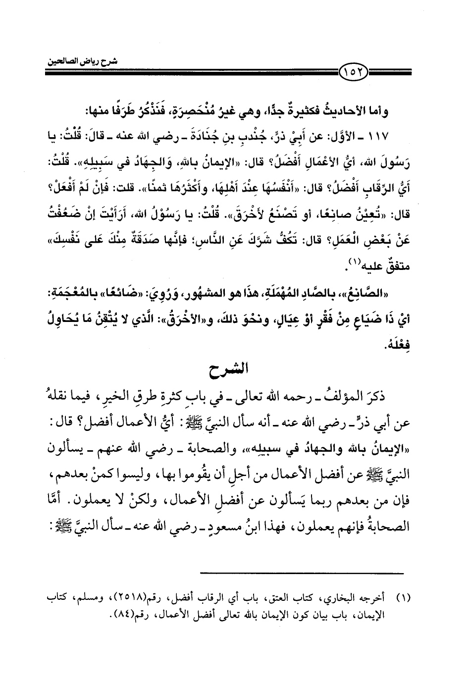 117 ـ الأول: عن أبى ذر جندب بن جنادة ـ رضي الله عنه ـ قال: قلت يا رسول الله، أي الأعمال أفضل؟ قال: (الإيمان بالله، والجهاد في سبيله) قلت: أي الرقاب أفضل؟ قال: (أنفسها عند أهلها، وأكثرها ثمناً) ، قلت: فإن لم أفعل؟ قال: تعين صانعاً، أو تصنع لأخرق) . قلت: يا رسول الله، أرأيت إن ضعفت عن بعض العمل؟ قال: تكف شرك عن الناس؛ فإنها صدقة على نفسك) متفق عليه.