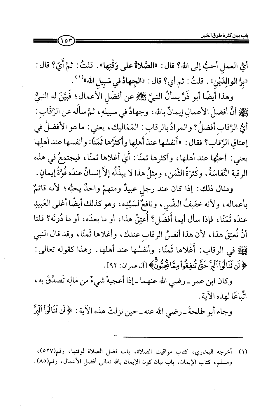 ومثال ذلك: إذا كان عند رجل عبيد ومنهم واحد يحبه؛ لأنه قائم بأعماله، ولأنه خفيف النفس، ونافع لسيده، وهو كذلك أيضاً أغلى العبيد عنده ثمناً، فإذا سألا أيما أفضل؟ أعتق هذا، أو ما بعده، أو ما دونه؟ قلنا أن تعتق هذا، لأن هذا أنفس الرقاب عندك، وأغلاها ثمناً، وقد قال النبي صلى الله عليه وسلم في الرقاب: أغلاها ثمناً، أنفسها عند أهلها. وهذا كقوله تعالى: (لَنْ تَنَالُوا الْبِرَّ حَتَّى تُنْفِقُوا مِمَّا تُحِبُّونَ) (آل عمران: 92) .