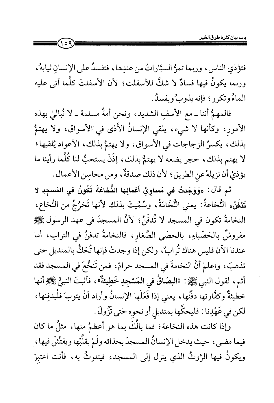 وإذا كانت هذه النخاعة، فما بالك بما هو أعظم منها، مثل ما كان فيما مضى، حيث يدخل الإنسان المسجد بحذائه ولم يقلبها ويفتش فيها، ويكون فيها الروث الذي ينزل إلى المسجد، فيتلوث به فأنت اعتبر