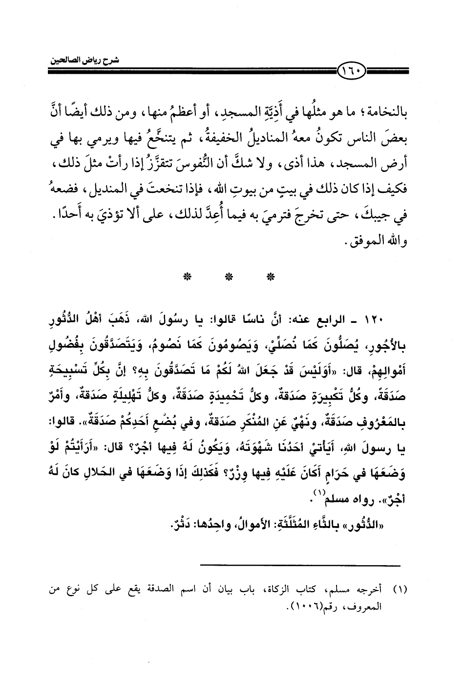 120 ـ الرابع: عنه: أن ناساً قالوا يا رسول الله: ذهب أهل الدثور بالأجور، يصلون كما نصلي، ويصومون كما نصوم، ويتصدقون بفضول أموالهم، قال: (أو ليس قد جعل الله لكم ما تصدقون به؟ إن بكل تسبيحه صدقة، وكل تكبيرة صدقة، وكل تحميدة صدقة، وكل تهليلة صدقة، وأمر بالمعروف صدقة، ونهي عن المنكر صدقة، وفي بضع أحدكم صدقة) قالوا: يا رسول الله، أيأتي أحدنا شهوته ويكون له فيها أجر؟ قال: (أرأيتم لو وضعها في حرام أكان عليه فيها وزر؟ فكذلك إذا وضعها في الحلال كان له أجر) رواه مسلم.
