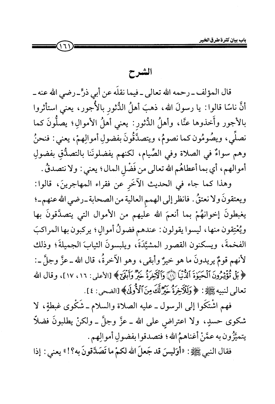 EXقال المؤلف ـ رحمه الله تعالى ـ فيما نقله عن أبي ذر ـ رضي الله عنه ـ أن ناساً قالوا: يا رسول الله، ذهب أهل الدثور بالأجور، يعني استأثروا بالأجور وأخذوها عنا، وأهل الدثور: يعني أهل الأموال؛ يصلون كما نصلي، ويصومون كما نصوم، ويتصدقون بفضول أموالهم؛ يعني: فنحن وهم سواء في الصلاة وفي الصيام، ولكنهم يفضلوننا بالتصدق بفضول أموالهم، أي بما أعطاهم الله تعالى من فضل المال؛ يعني: ولا نتصدق.