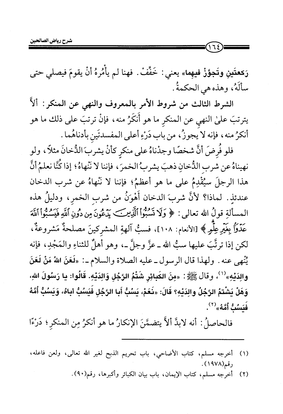 فلو فرض أن شخصاً وجدناه على منكر كأن يشرب الدخان مثلاً، ولو نهيناه عن شرب الدخان ذهب يشرب الخمر، فإننا لا ننهاه؛ إذ كنا نعلم أن هذا الرجل سيقدم على ما هو أعظم؛ فإننا لا ننهاه عن شرب الدخان عندئذ. لماذا؟ لأن شرب الدخان أهون من شرب الخمر، ودليل هذه المسألة قول الله تعالى: (وَلا تَسُبُّوا الَّذِينَ يَدْعُونَ مِنْ دُونِ اللَّهِ فَيَسُبُّوا اللَّهَ عَدْواً بِغَيْرِ عِلْمٍ) (الأنعام: 108) ، فسب آلهة المشركين مصلحة مشروعة، لكن إذا ترتب عليها سب الله ـ عز وجل ـ وهو أهل للثناء والمجد، فإنه ينهى عنه. لهذا قال الرسول ـ عليه الصلاة والسلام: (لعن الله من لعن والديه) ، وقال صلى الله عليه وسلم: (من الكبائر شتم الرجل والديه. قالوا: يا رسول الله، وهل يشتم الرجل والديه؟ قال: (نعم يسب أبا الرجل فيسب أباه، ويسب أمه فيسب أمه) .