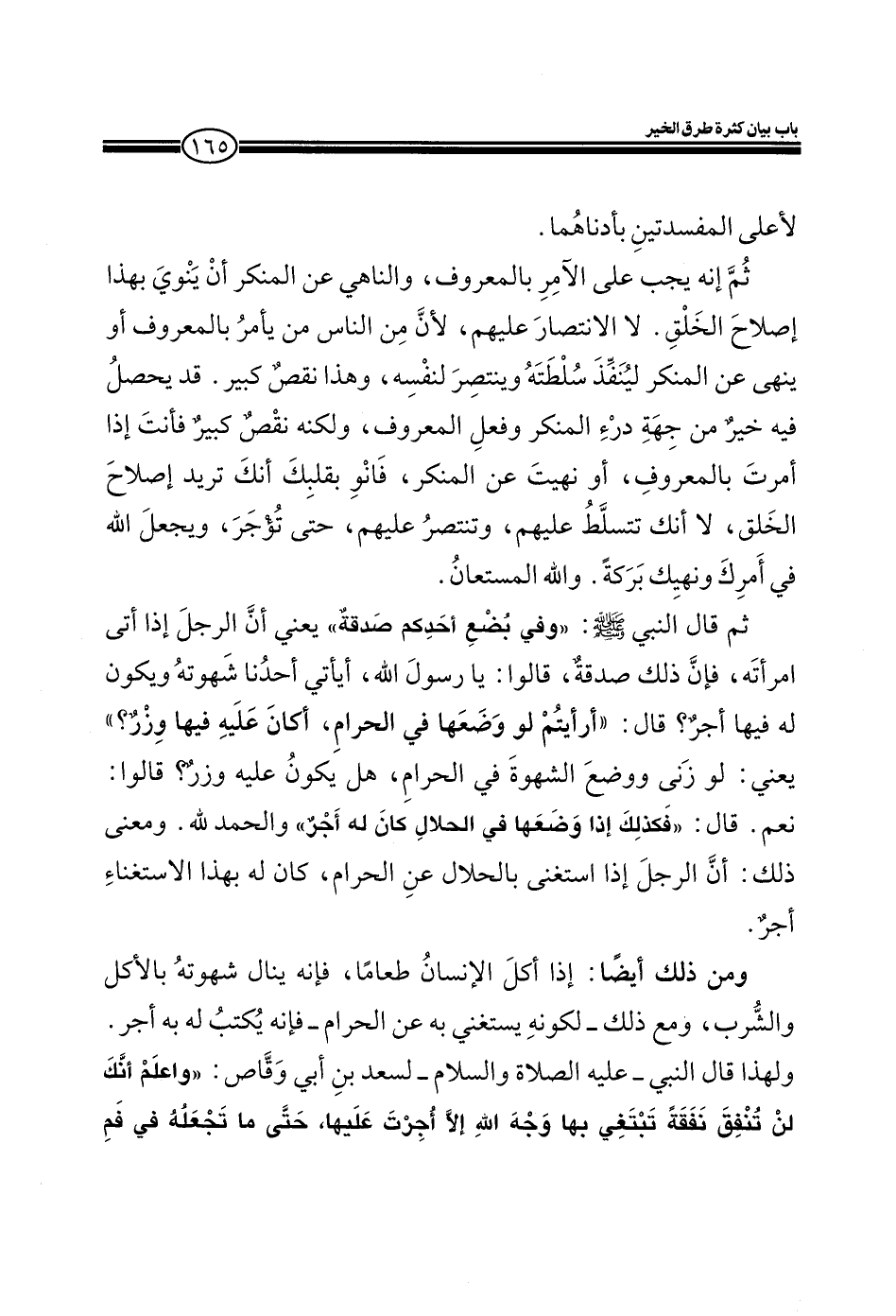 ثم إنه يجب على الآمر بالمعروف، والناهي عن المنكر أن ينوي بهذا إصلاح الخلق. لا الانتصار عليهم، لأن من الناس من يأمر بالمعروف أو ينهي عن المنكر لينفذ سلطته وينتصر لنفسه، وهذا نقص كبير. قد يحصل فيه خير من جهة درء المنكر وفعل المعرف، ولكنه نقص كبير فأنت إذا أمرت بالمعروف، أو نهيت عن المنكر، فانو بقلبك أنك تريد إصلاح الخلق، لا أنك تتسلط عليهم، وتنتصر عليهم، حتى تؤجر، ويجعل الله في أمرك ونهيك بركة. والله المستعان.