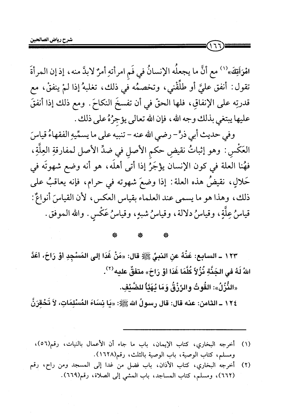 123 ـ السابع: عنه عن النبي صلى الله عليه وسلم قال: (من غدا إلى المسجد أو راح، أعد الله له في الجنة نزلاً كلما غدا أو راح) متفق عليه.