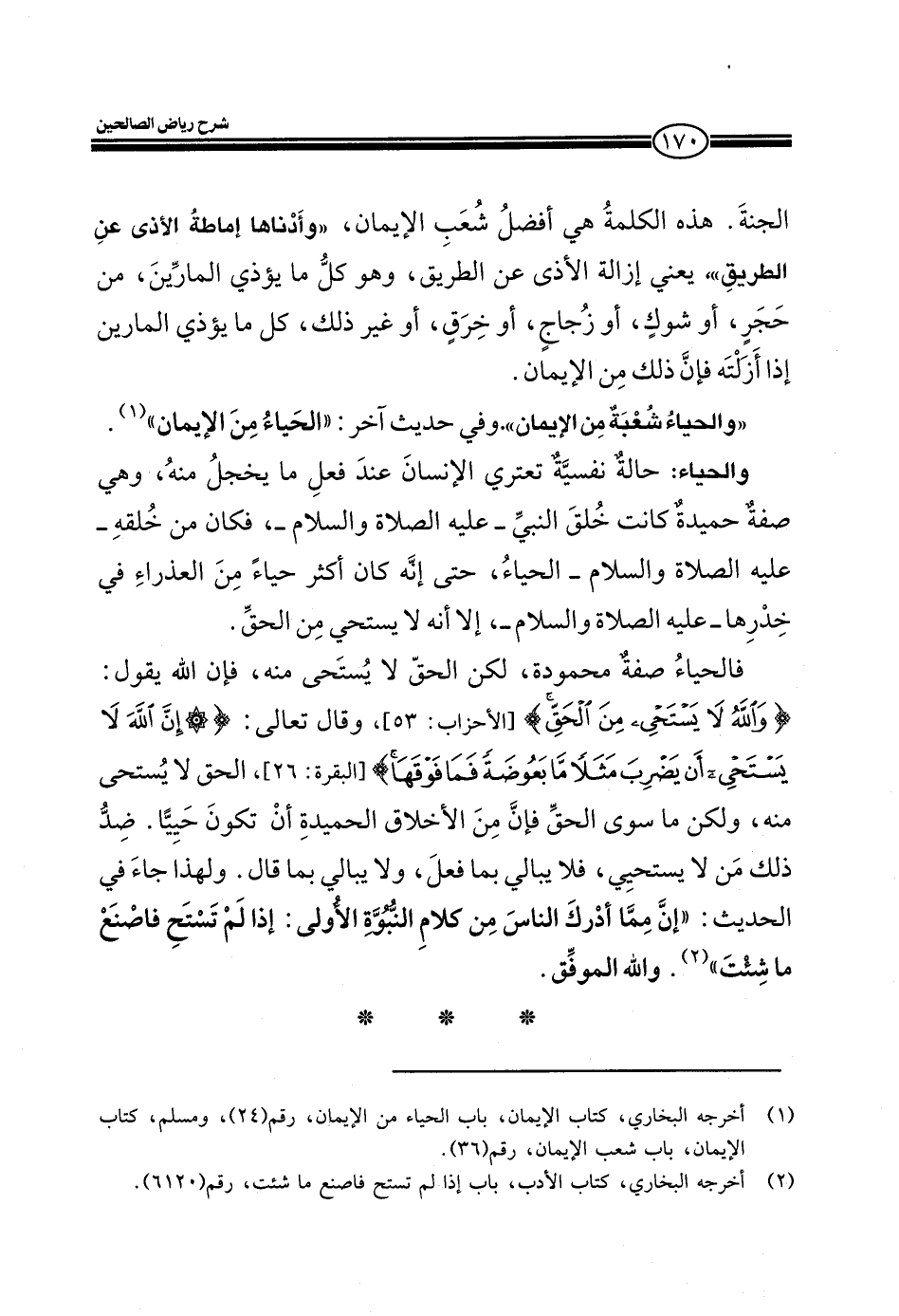 (والحياء شعبة من الإيمان) وفي حديث آخر: (الحياء من الإيمان) . والحياء: حالة نفسية تعتري الإنسان عند فعل ما يخجل منه، وهي صفة حميدة كانت خلق النبي ـ عليه الصلاة والسلام ـ فكان من خلقه ـ عليه الصلاة والسلام ـ الحياء، حتى أنه كان أكثر حياء من العذراء في خدرها ـ عليه الصلاة والسلام ـ إلا أنه لا يستحي من الحق.