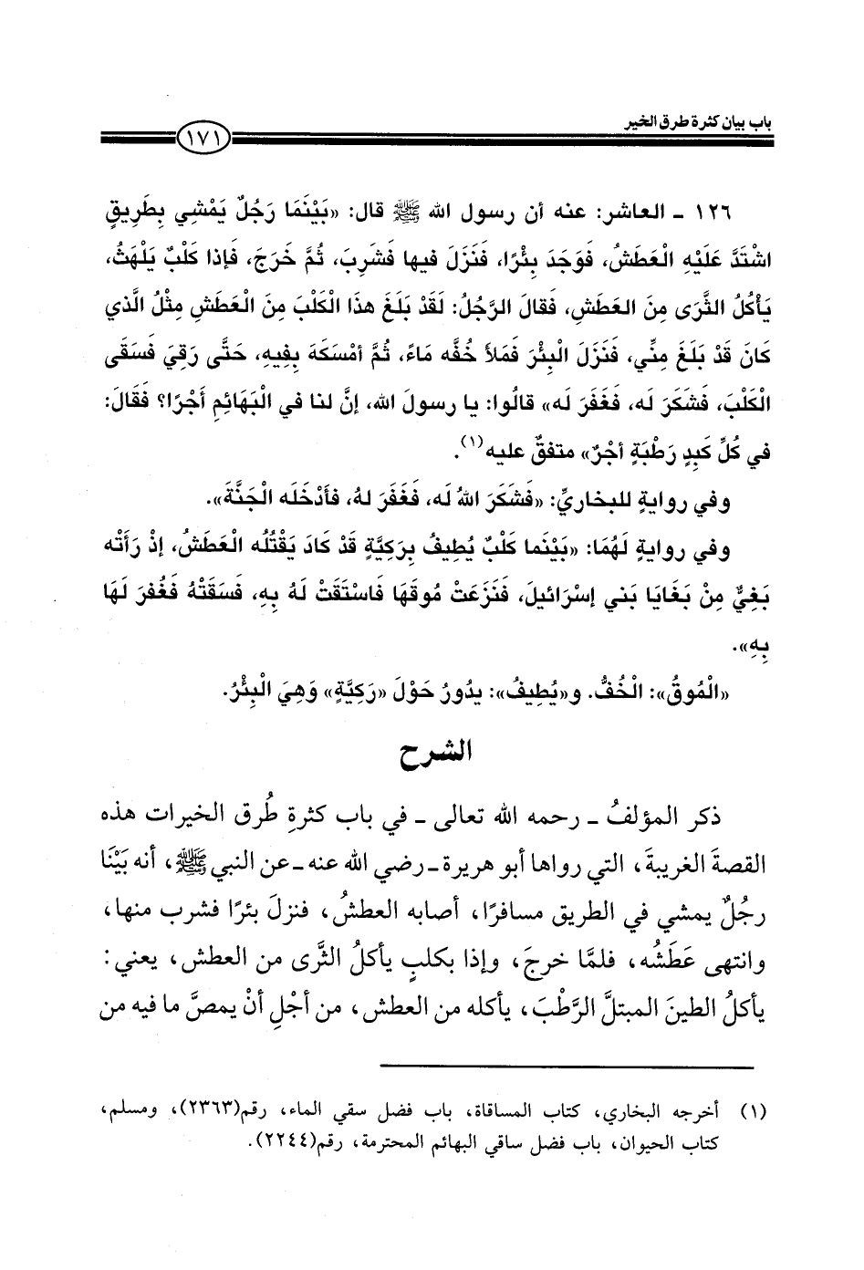 126 ـ العاشر: عنه أن رسول الله صلى الله عليه وسلم قال: (بينما رجل يمشي بطريق اشتد عليه العطش، فوجد بئراً، فنزل فيها فشرب، ثم خرج فإذا كلب يلهث، يأكل الثرى من العطش، فقال الرجل: لقد بلغ هذا الكلب من العطش مثل الذي كان قد بلغ مني، فنزل البئر فملأ خفه ماء، ثم أمسكه بفيه، حتى رقى فسقى الكلب، فشكر له، فغفر له قالوا: يا رسول الله إن لنا في البهائم أجراً فقال في كل كبدٍ رطبةٍ أجر) متفق عليه.