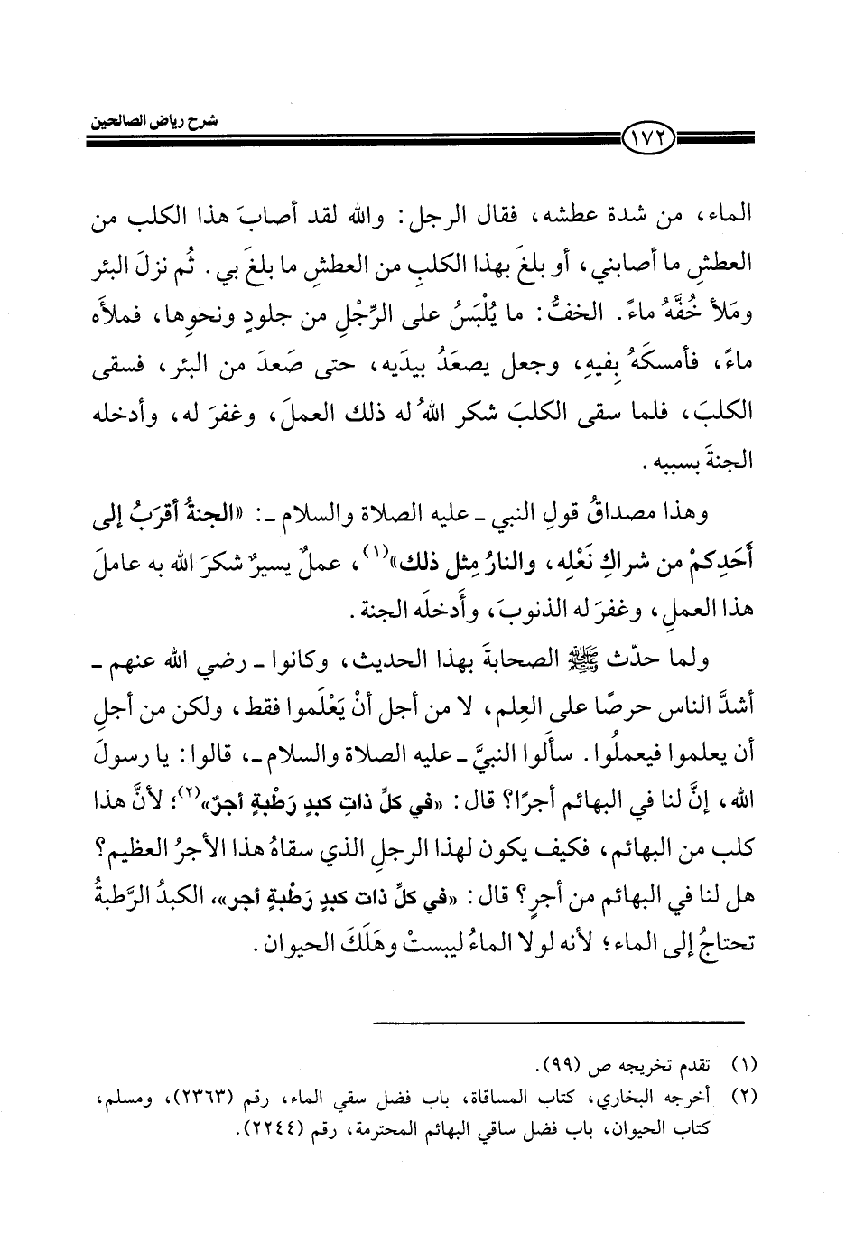ولما حدث صلى الله عليه وسلم الصحابة بهذا الحديث، وكانوا ـ رضي الله عنهم -أشد الناس حرصاً على العلم، لا من أجل أن يعلموا فقط، لكن من أجل أن يعلموا فيعملوا. سألوا النبي ـ عليه الصلاة والسلام ـ قالوا: يا رسول الله، إن لنا في البهائم أجراً؟ قال: (في كل ذات كبدٍ رطبةٍ أجر) ؛ لأن هذا كلب من البهائم، فكيف يكون لهذا الرجل الذي سقاه هذا الأجر العظيم؟ هل لنا في البهائم من أجر؟ قال: (في كل ذات كبد رطبة أجر) الكبد الرطبة تحتاج إلى الماء؛ لأنه لولا الماء ليبست وهلك الحيوان.