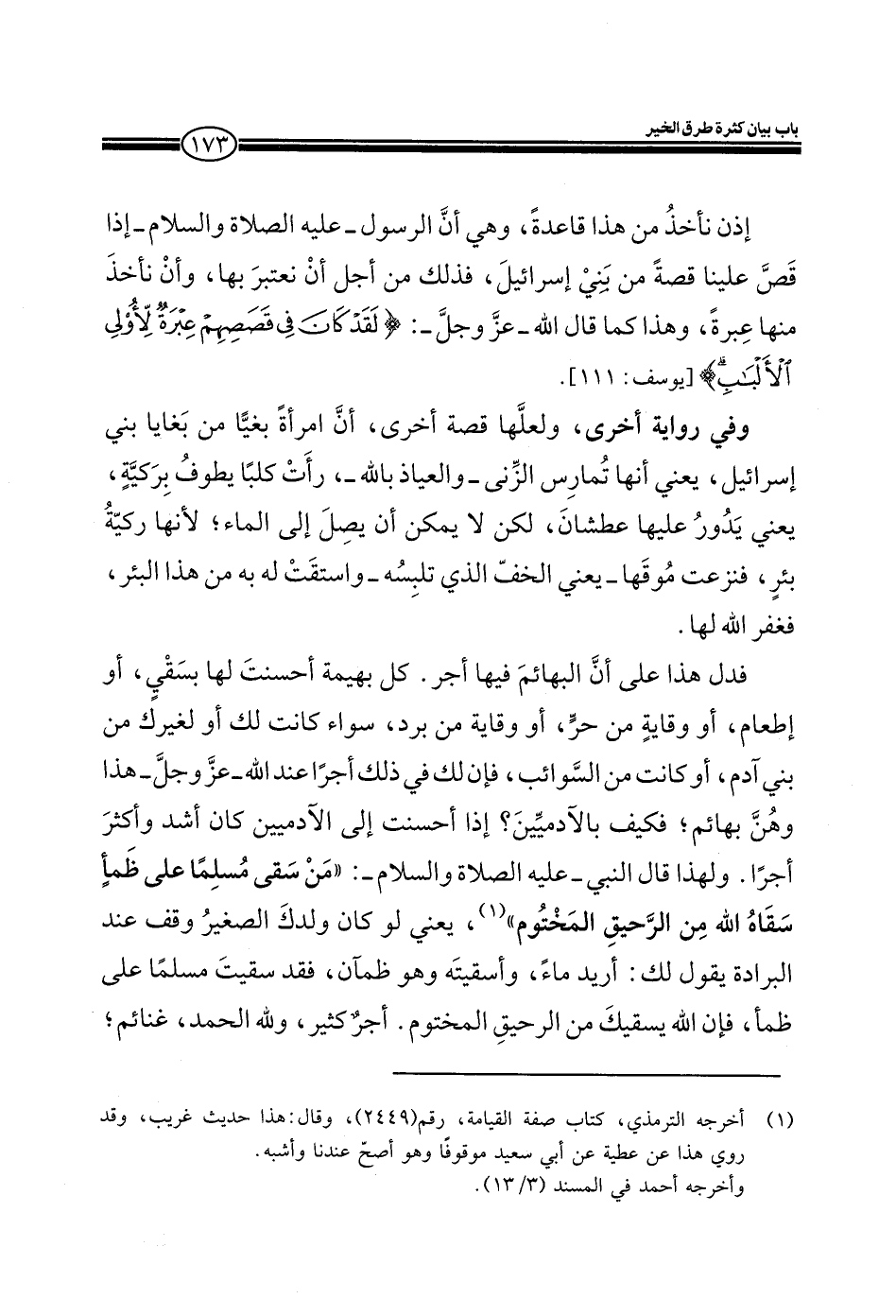 فدل هذا على أن البهائم فيها أجر. كل بهيمة أحسنت لها بسقي، أو إطعام، أو وقاية من حر، أو وقاية من برد، سواء كانت لك أو لغيرك من بني آدم، أو كانت من السوائب، فإن لك في ذلك أجراً عند الله ـ عز وجل ـ هذا وهن بهائم؛ فكيف بالآدميين؟ إذا أحسنت إلى الآدميين كان أشد وأكثر أجراً. ولهذا قال النبي ـ عليه الصلاة والسلام ـ (من سقى مسلماً على ظمأ سقاه الله من الرحيق المختوم) ، يعني لو كان ولدك الصغير وقف عند البرادة يقول لك: أريد ماء، وأسقيته وهو ظمآن، فقد سقيت مسلماً على ظمأ، فإن الله يسقيك من الرحيق المختوم. أجر كثير، ولله الحمد، غنائم
