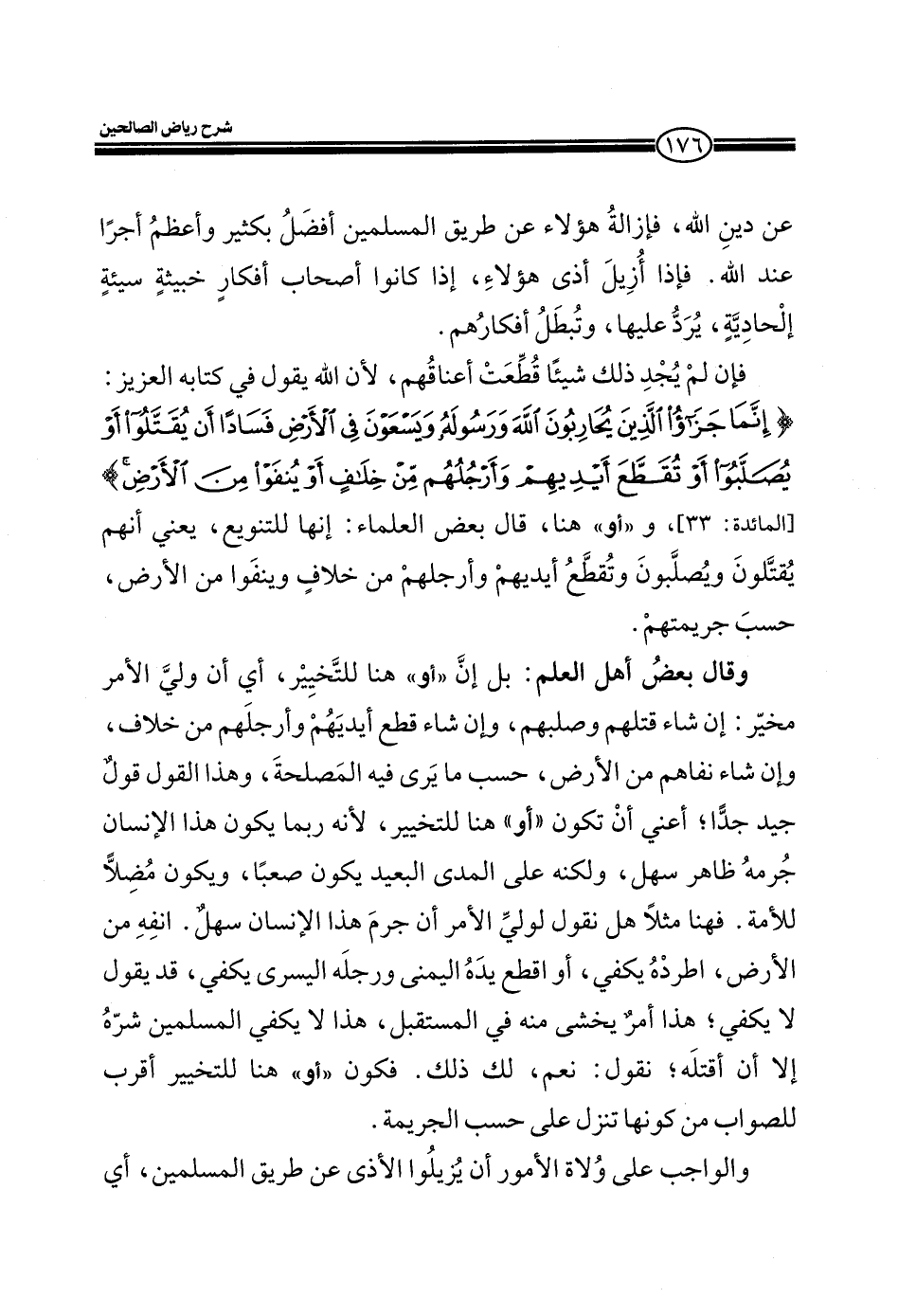 وقال بعض أهل العلم: بل إن (أو) هنا للتخيير، أي أن ولي الأمر مخير: أن شاء قتلهم وصلبهم، وإن شاء قطع أيديهم وأرجلهم من خلاف، وإن شاء نفاهم من الأرض، حسب ما يرى فيه المصلحة، وهذا القول قول جيد جداً؛ اعني أن تكون (أو) هنا للتخيير لأنه ربما يكون هذا الإنسان جرمه ظاهر سهل، ولكنه على المدى البعيد يكون صعباً، ويكون مضلاً للأمة. فهنا مثلاً هل نقول لولي الأمر أن جرم هذا الإنسان سهل. أنفه من الأرض، أطرده يكفي، أو اقطع يده اليمنى ورجله اليسرى يكفي، قد يقول لا يكفي؛ هذا أمر يخشى منه في المستقبل، هذا لا يكفي المسلمين شره إلا أن أقتله؛ نقول: نعم لك ذلك. فكون (أو) هنا للتخيير أقرب للصواب من كونها تنزل على حسب الجريمة.