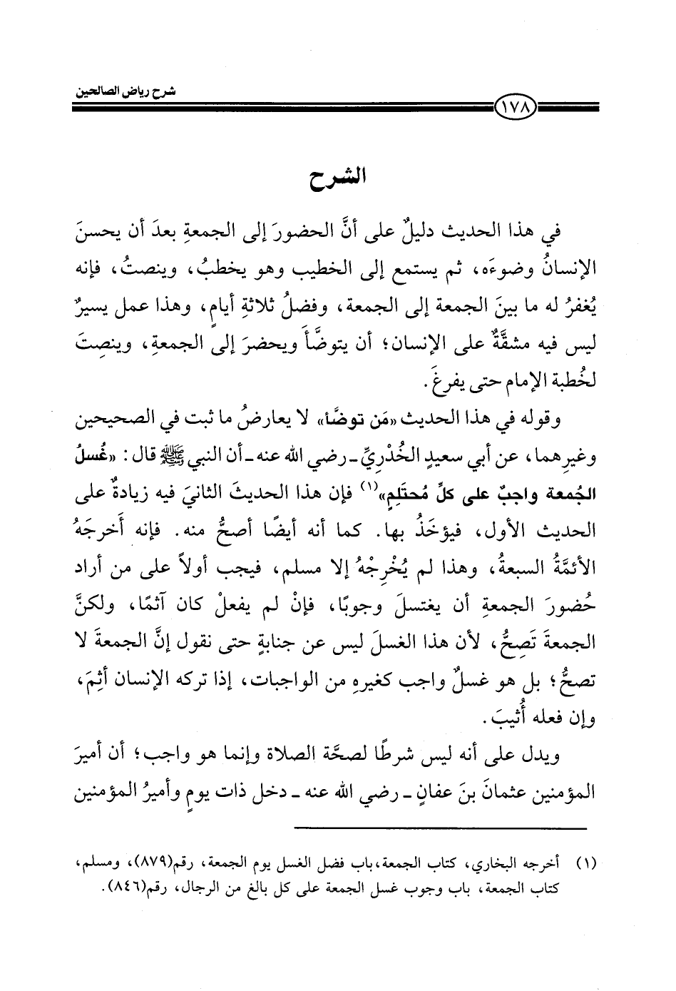 وقوله في هذا الحديث (من توضأ) لا يعارض ما ثبت في الصحيحين وغيرهما، عن أبي سعيد الخدري ـ رضي الله عنه ـ أن النبي صلى الله عليه وسلم قال: (غسل الجمعة واجب على كل محتلم) فإن هذا الحديث الثاني فيه زيادة على الحديث الأول، فيؤخذ بها. كما أنه أيضاً أصح منه. فإنه أخرجه الأئمة السبعة، وهذا لم يخرجه إلا مسلم، فيجب أولاً على من أراد حضور الجمعة أن يغتسل وجوباً، فإن لم يفعل كان آثماً، ولكن الجمعة تصح، لأن هذا الغسل ليس عن جنابة حتى نقول أن الجمعة لا تصح؛ بل هو غسل واجب كغيره من الوجبات، إذا تركه الإنسان أثم وإن فعله أثيب.