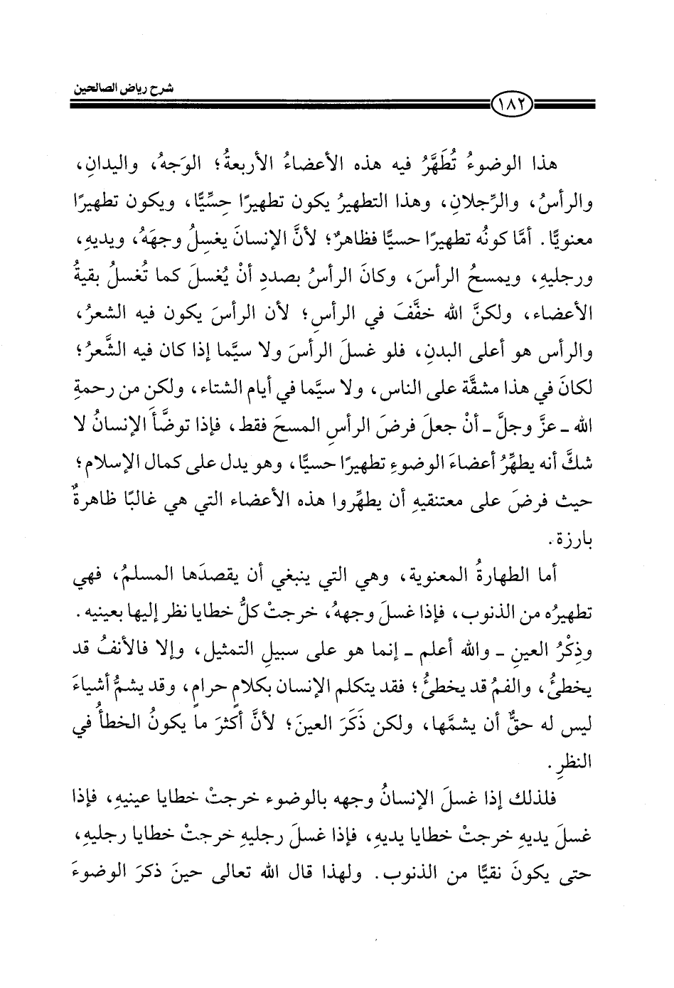 هذا الوضوء تطهر فيه الأعضاء الأربعة؛ الوجه، اليدان، والرأس، والرجلان، وهذا التطهير يكون تطهيراً حسياً، ويكون تطهيراً معنوياً. أما كونه تطهيراً حسياً فظاهر؛ لأن الإنسان يغسل وجهه، ويديه، ورجليه، ويمسح الرأس، وكان الرأس بصدد أن يغسل كما تغسل بقية الأعضاء، ولكن الله خفف في الرأس؛ ولأن الرأس يكون فيه الشعر، والرأس هو أعلى البدن، فلو غسل الرأس ولا سيما إذا كان فيه الشعر؛ لكان في هذه مشقة على الناس، ولا سيما في أيام الشتاء، ولكن من رحمة الله ـ عز وجل ـ أن جعل فرض الرأس المسح فقط، فإذا توضأ الإنسان لا شك أنه يطهر أعضاء الوضوء تطهيراً حسياً، وهو يدل على كمال الإسلام؛ حيث فرض على معتنقيه أن يطهروا هذه الأعضاء التي هي غالباً ظاهرة بارزة.