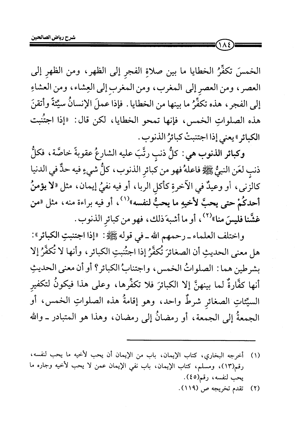 واختلف العلماء ـ رحمهم الله ـ في قوله صلى الله عليه وسلم: (إذا اجتنبت الكبائر) هل معني الحديث أن الصغائر تكفر إذا اجتنبت الكبائر، وأنها لا تكفر إلا بشرطين هما: الصلوات الخمس، واجتناب الكبائر؟ أو أن معنى الحديث أنها كفارة لما بينهن إلا الكبائر فلا تكفرها، وعلى هذا فيكون لتكفير السيئات الصغائر شرط واحد، وهو إقامة هذه الصلوات الخمس، أو الجمعة إلى الجمعة، أو رمضان إلى رمضان، وهذا هو المتبادر ـ والله