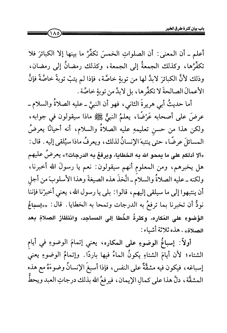أما حديث أبي هريرة الثاني، فهو أن النبي ـ عليه الصلاة والسلام ـ عرض على أصحابه عرضاً، يعلم النبي صلى الله عليه وسلم ماذا سيقولون في جوابه، ولكن هذا من حسن تعليمه عليه الصلاة والسلام، أنه أحياناً يعرض المسائل عرضاً، حتى ينتبه الإنسان لذلك، ويعرف ماذا سيلقى إليه، قال: (ألا أدلكم على ما يمحو الله به الخطايا، ويرفع به الدرجات؟) يعرض عليهم هل يخبرهم، ومن المعلوم أنهم سيقولون: نعم يا رسول الله أخبرنا، ولكنه ـ عليه الصلاة والسلام ـ اتخذ هذه الصيغة وهذا الأسلوب من أجل أن ينتبهوا إلى ما سيلقى إليهم، قالوا: بلى يا رسول الله، يعني أخبرنا فإننا نود أن تخبرنا بما ترفع به الدرجات وتمحا به الخطايا، قال: (إسباغ الوضوء على المكاره، وكثرة الخطا إلى المساجد، وانتظار الصلاة بعد الصلاة) هذه ثلاثة أشياء: