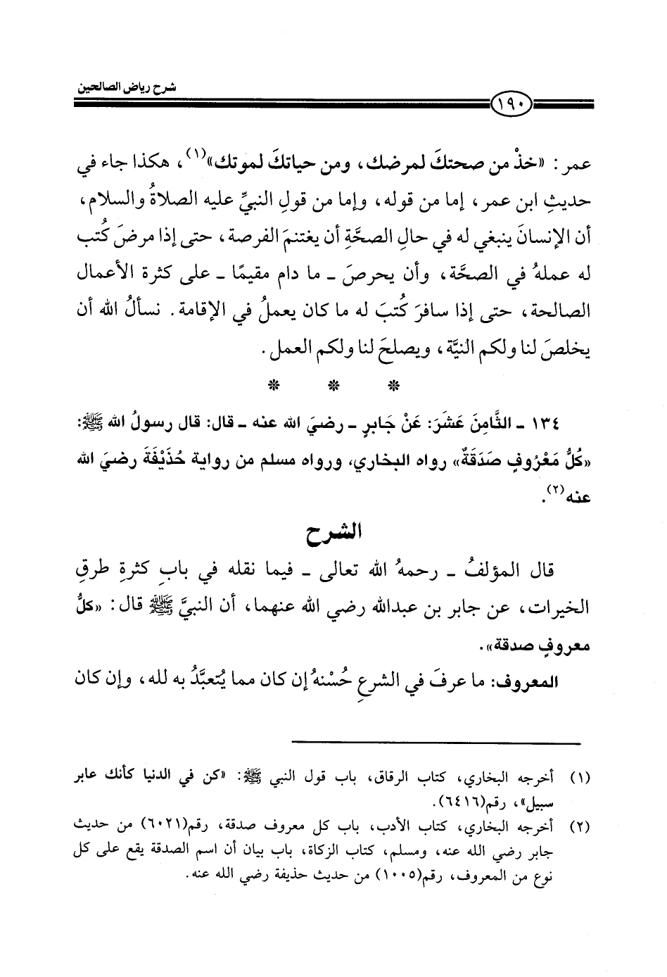 134 ـ الثامن عشر: عن جابر ـ رضي الله عنه ـ قال: قال رسول الله صلى الله عليه وسلم (كل معروف صدقة) رواه البخاري، ورواه مسلم من رواية حذيفة رضي الله عنه.