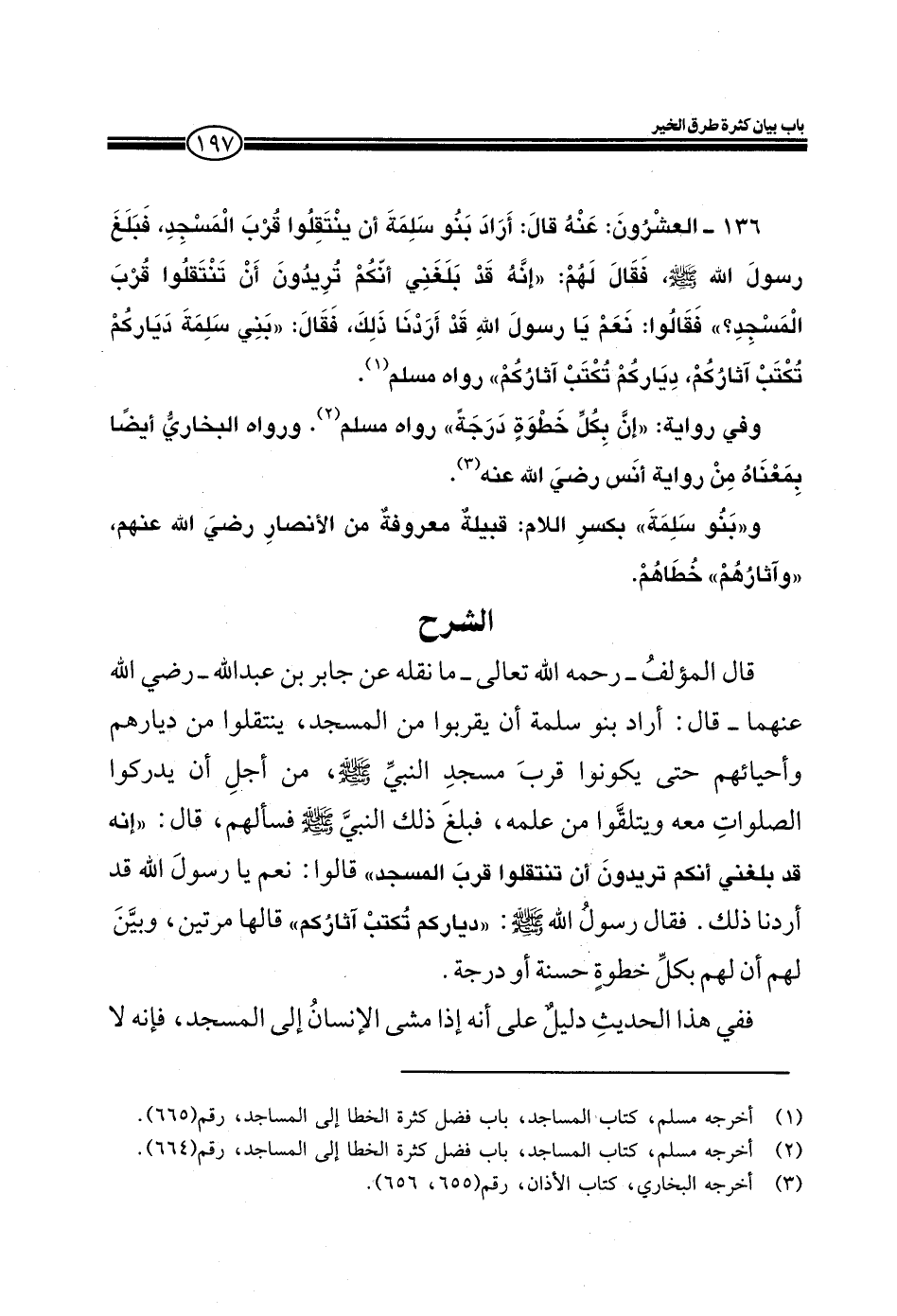 136 ـ العشرون: عنه قال: أراد بنو سلمة أن ينتقلوا قرب المسجد فبلغ رسول الله صلى الله عليه وسلم فقال لهم: (إنه قد بلغني أنكم تريدون أن تنتقلوا قرب المسجد؟) فقالوا: نعم يا رسول الله قد أردنا ذلك، فقال: (بني سلمة دياركم تكتب آثاركم، دياركم تكتب آثاركم) رواه مسلم.