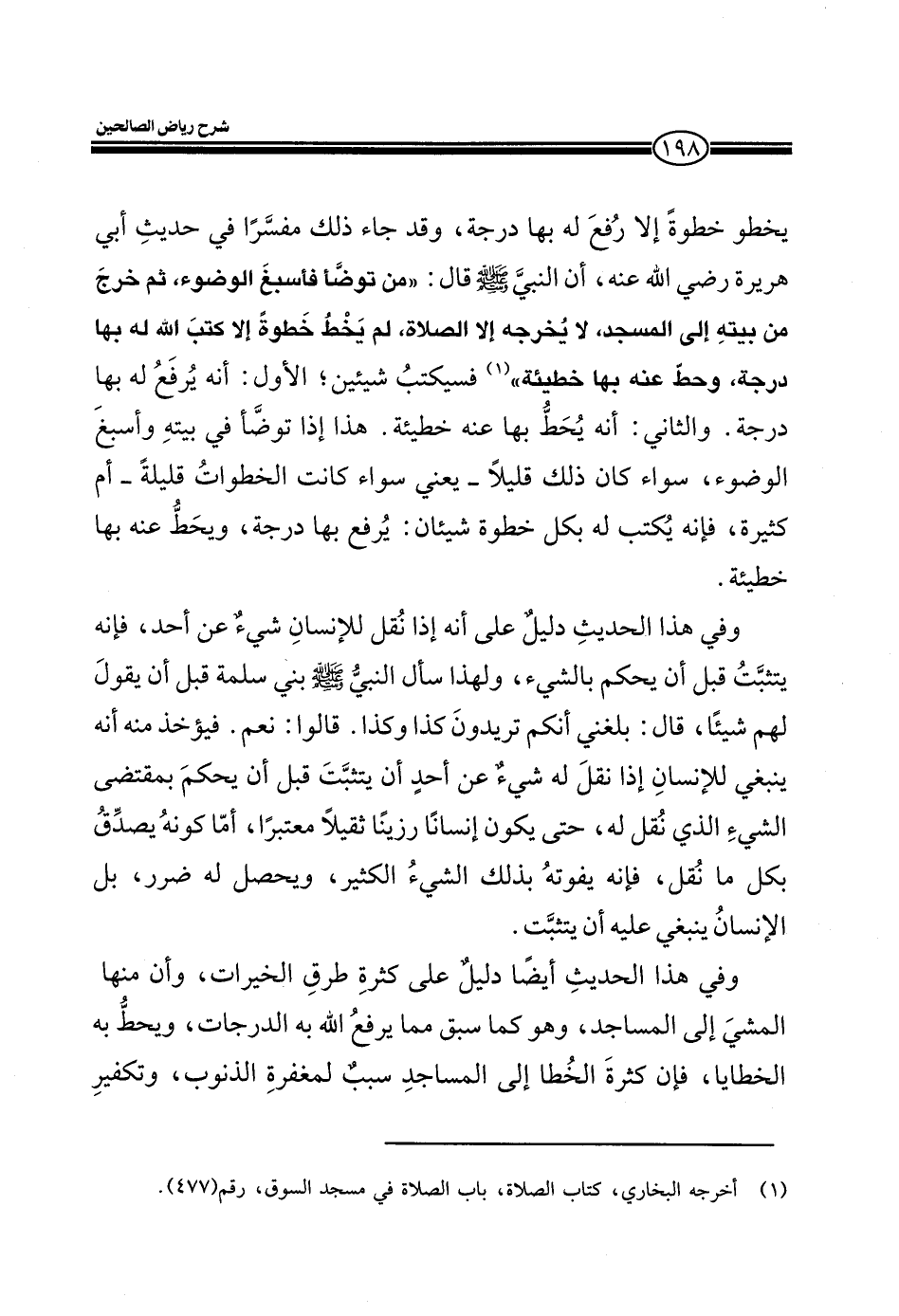 يخطو خطوة إلا رفع له بها درجة، وقد جاء ذلك مفسراً في حديث أبي هريرة رضي الله عنه، أن النبي صلى الله عليه وسلم قال: (من توضأ فأسبغ الوضوء، ثم خرج من بيته إلى المسجد، لا يخرجه إلا الصلاة، لم يخط خطوة إلا كتب الله له بها درجة، وحط عنه بها خطيئة) فسيكتب شيئين الأول: أنه يرفع له بها درجة. والثاني: أنه يحط بها عنه خطيئة. هذا إذا توضأ في بيته وأسبغ الوضوء سواء كان ذلك قليلاً ـ يعني سواء كانت الخطوات قليلة ـ أم كثيرة، فإنه يكتب له بكل خطوة شيئان: يرفع بها درجة، ويحط عنه بها خطيئة.