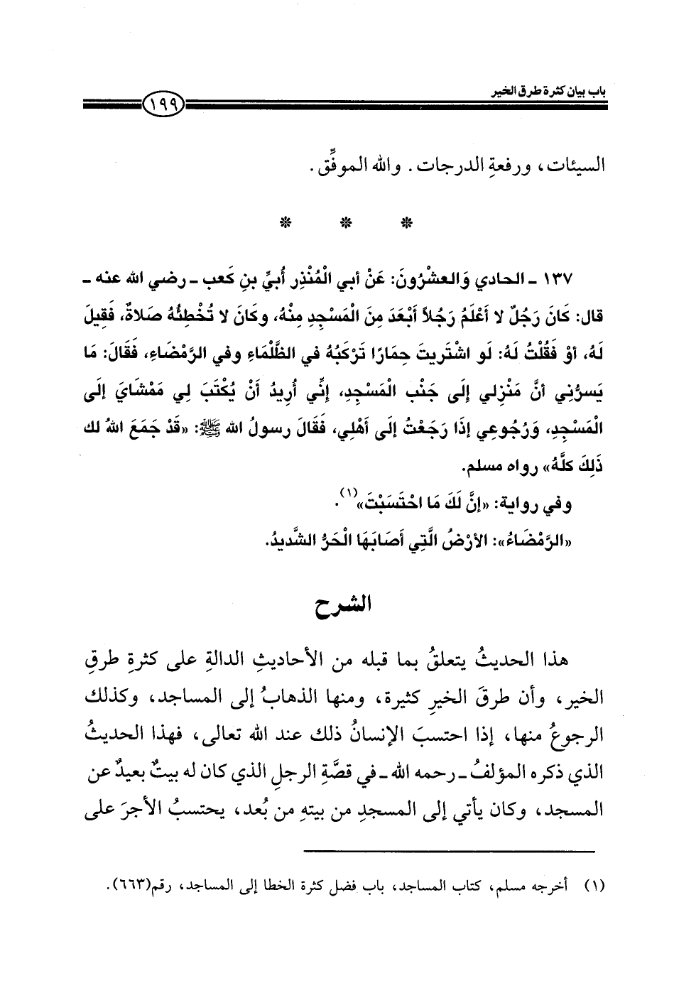 137 ـ الحادي والعشرون: عن أبي المنذر أبي بن كعب ـ رضي الله عنه ـ قال: كان رجل لا أعلم رجلاً أبعد من المسجد منه، وكان لا تخطئه صلاة، فقيل له، أو فقلت له اشتريت حماراً تركبه في الظلماء وفي الرمضاء، فقال: ما يسرني أن منزلي إلى جنب المسجد، إني أريد أن يكتب لي ممشاي إلى المسجد، ورجوعي إذا رجعت إلى أهلي، فقال رسول الله صلى الله عليه وسلم: (قد جمع الله لك ذلك كله) رواه مسلم.