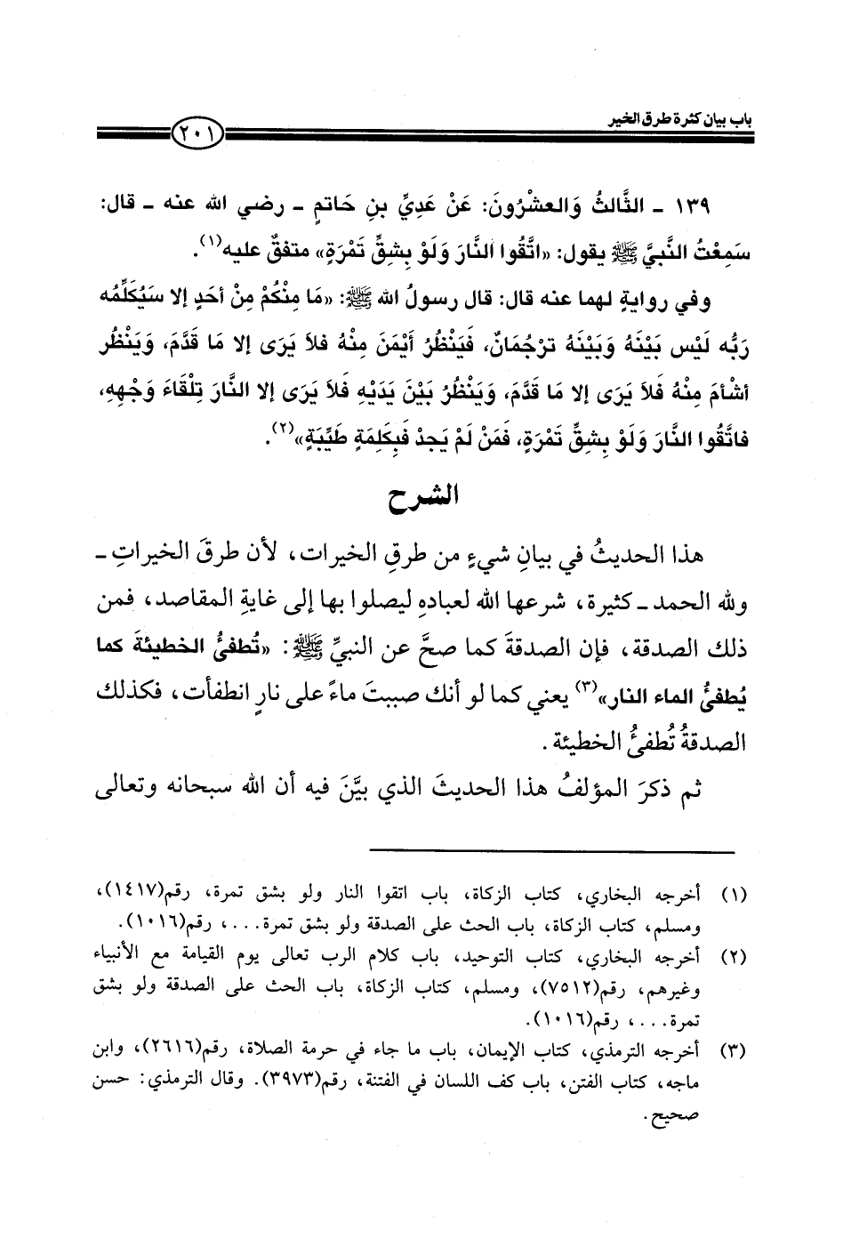 139 ـ الثالث والعشرون: عن عدي بن حاتم ـ رضي الله عنه ـ قال: سمعت النبي صلى الله عليه وسلم يقول: (اتقوا النار ولو بشق تمرة) متفق عليه.