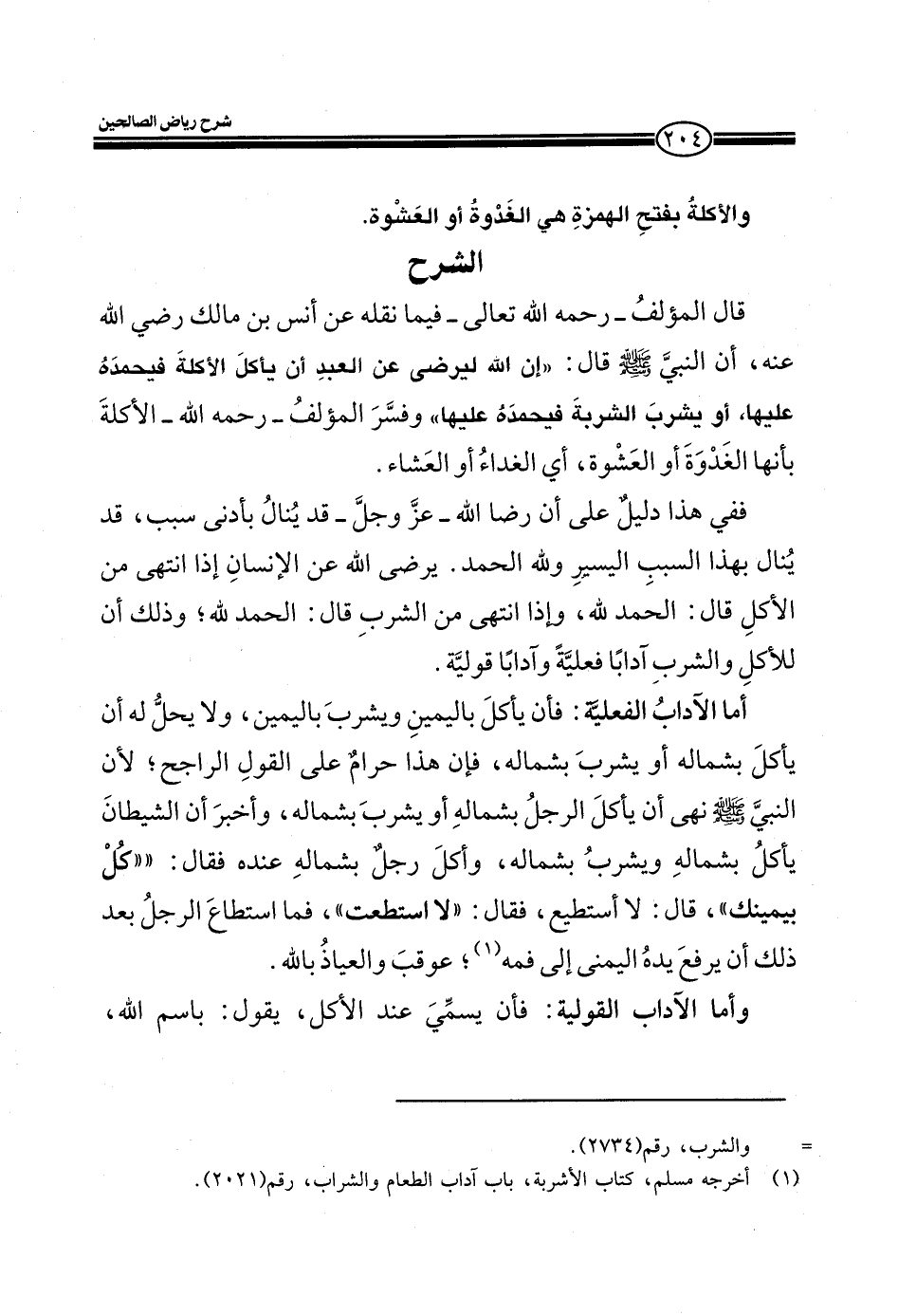 EXقال المؤلف ـ رحمه الله تعالى ـ فيما نقله عن أنس بن مالك رضي الله عنه، أن النبي صلى الله عليه وسلم قال: (إن الله ليرضى عن العبد أن يأكل الأكلة فيحمده عليها، أو يشرب الشربة فيحمده عليها) وفسر المؤلف ـ رحمه الله ـ الأكلة بأنها الغدوة أو العشوة، أي الغداء أو العشاء.