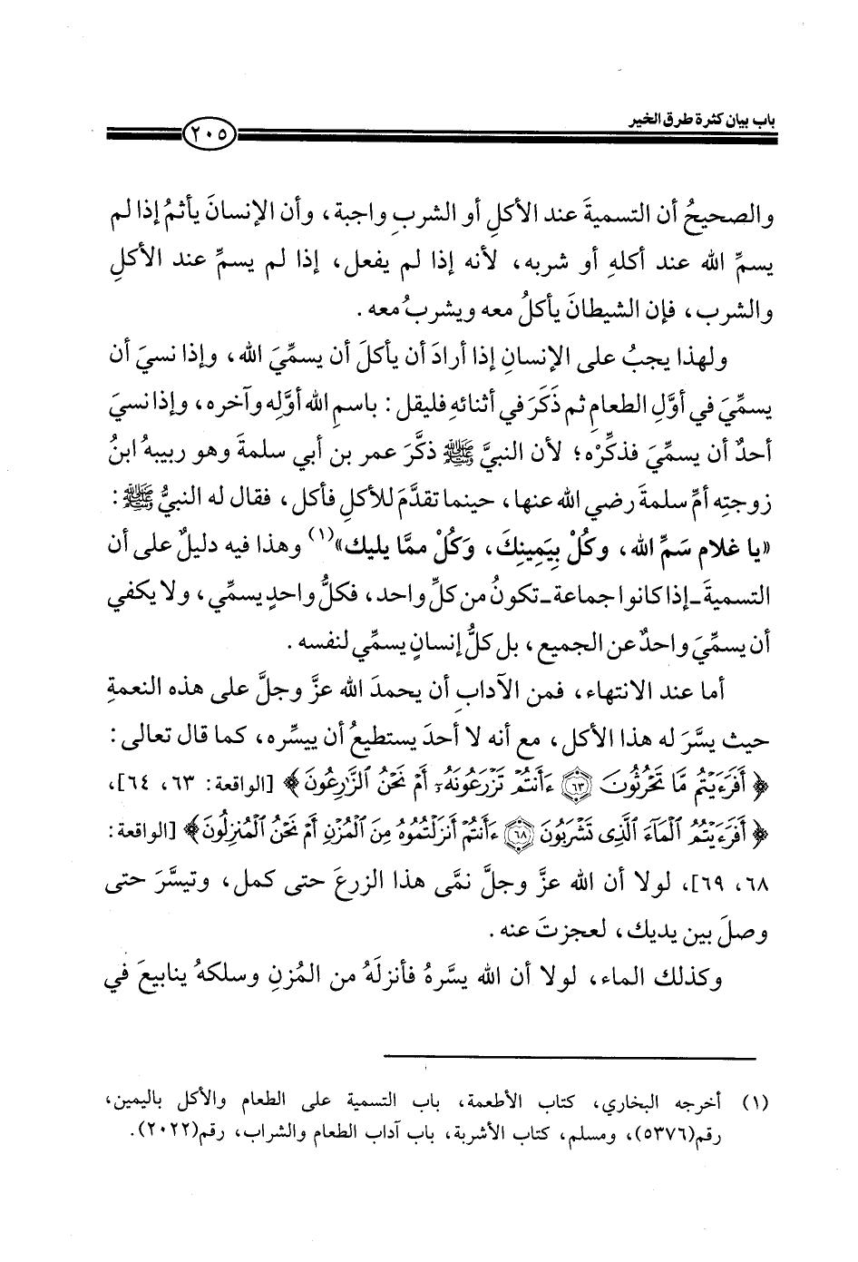 ولهذا يجب على الإنسان إذا أراد يأكل أن يسمي الله، وإذا نسى أن يسمي في أول الطعام ثم ذكر في أثنائه فليقل: باسم الله أوله وآخره، وإذا نسى أحد أن يسمي فذكره؛ لأن النبي صلى الله عليه وسلم ذكر عمر بن أبي سلمة وهو ربيبه بن زوجته أم سلمة رضي الله عنها، حينما تقدم للأكل فأكل، فقال له النبي صلى الله عليه وسلم: (يا غلام سم الله، وكل بيمينك، وكل مما يليك) وهذا فيه دليل على أن التسمية ـ إذا كانوا جماعة ـ تكون من كل واحد، فكل واحد يسمي، ولا يكفي أن يسمي واحد عن الجميع، بل كل إنسان يسمي لنفسه.