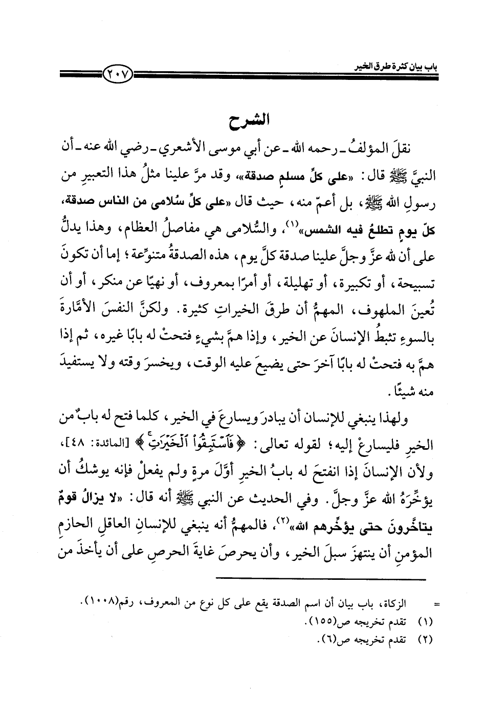 EXنقل المؤلف ـ رحمه الله ـ عن أبي موسى الأشعري ـ رضي الله عنه ـ أن النبي صلى الله عليه وسلم قال: (على كل مسلم صدقة) وقد مر علينا مثل هذا التعبير من رسول الله صلى الله عليه وسلم، بل أعم منه، حيث قال: (على كل سلامي من الناس صدقة، كل يوم تطلع فيه الشمس) ، والسلامى هي مفاصل العظام، وهذا يدل على أن لله عز وجل علينا صدقة كل يوم، هذه الصدقة متنوعة؛ إما أن تكون تسبيحة، أو تكبيرة، أو تهليلة، أو أمر بمعروف، أو نهياً عن منكر، أو أن تعين الملهوف، المهم أن طرق الخيرات كثيرة. ولكن النفس الأمارة بالسوء تثبط الإنسان عن الخير، وإذا هم بشيء فتحت له باباً غيره، ثم إذا هم به فتحت له باباً آخر حتى يضيع عليه الوقت، ويخسر وقته ولا يستفيد منه شيئاً.