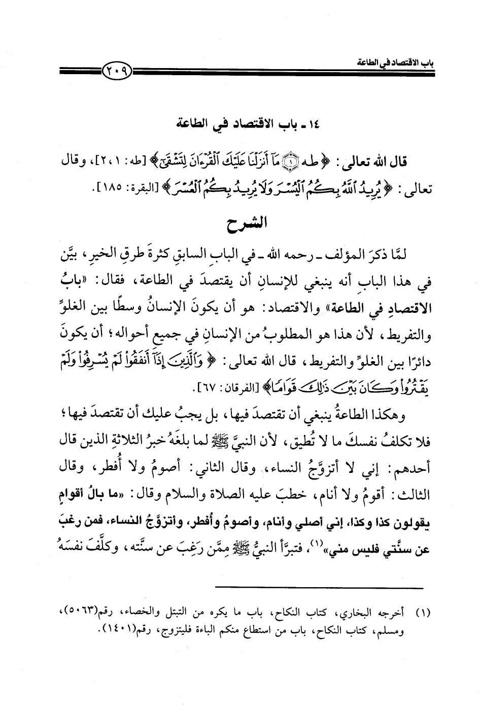 EXلما ذكر المؤلف ـ رحمة الله ـ في باب السابق كثرة طرق الخير، بين في هذا الباب أنه ينبغي للإنسان أن يقتصد في الطاعة، فقال: (باب اقتصاد في الطاعة) والاقتصاد: هو أن يكون الإنسان وسطاً بين الغلو والتفريط، لأن هذا هو المطلوب من الإنسان في جميع أحواله؛ أن يكون دائراً بين الغلو والتفريط، قال الله تعالى: (وَالَّذِينَ إِذَا أَنْفَقُوا لَمْ يُسْرِفُوا وَلَمْ يَقْتُرُوا وَكَانَ بَيْنَ ذَلِكَ قَوَاماً) (الفرقان: 67) .