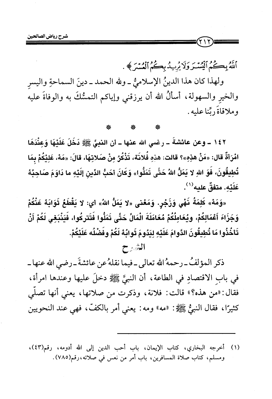 142ـ وعن عائشة ـ رضي الله عنها ـ أن النبي صلى الله عليه وسلم دخل عليها وعندها امرأة قال: (من هذه؟) قالت: هذه فلانة تذكر من صلاتها، قال: (مه) ، عليكم بما تطيقون، فو الله لا يمل الله حتى تملوا) وكان أجب الذين إليه ما داوم صاحبه عليه. متفق عليه.