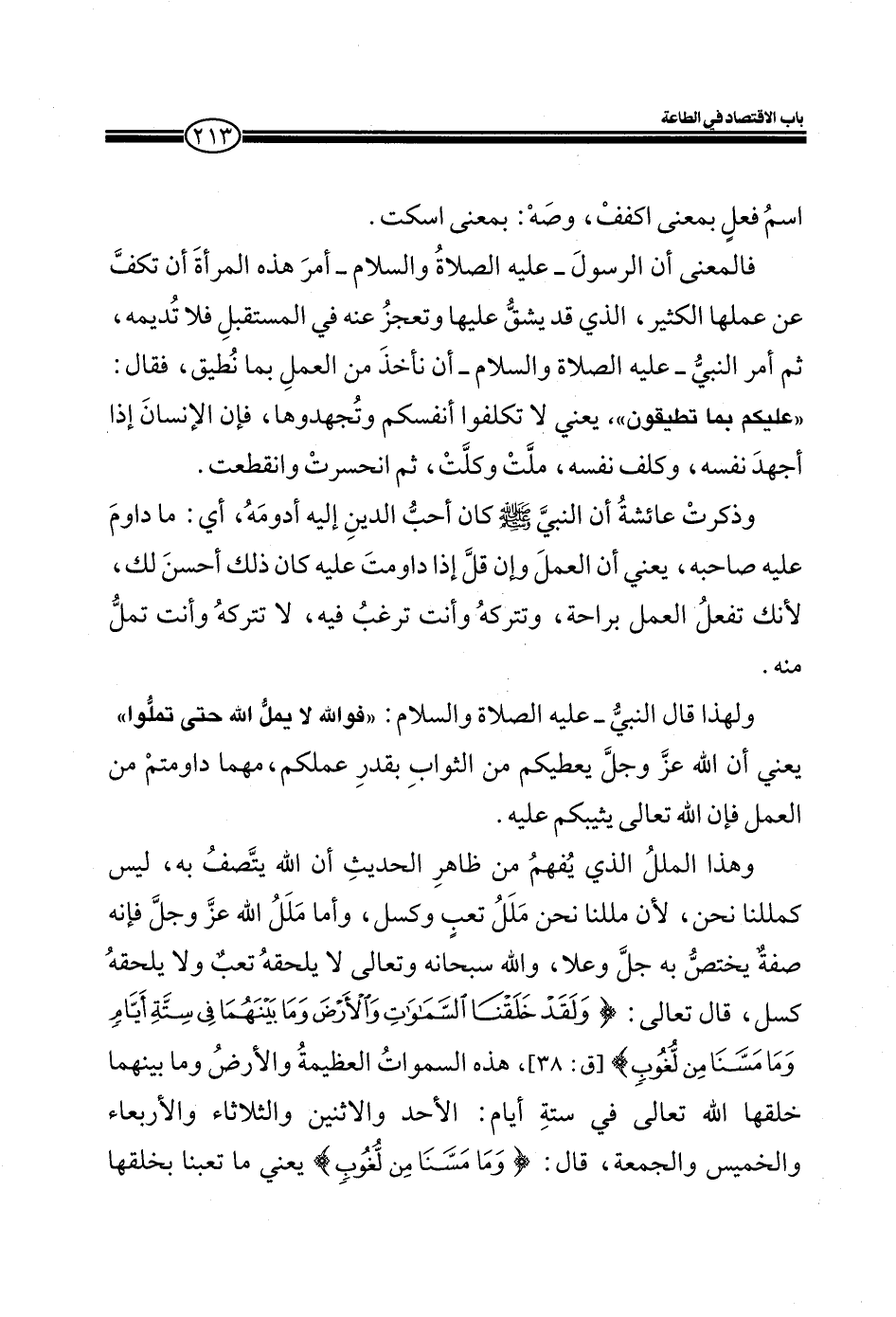 وهذا الملل الذي يفهم من ظاهر الحديث أن الله يتصف به، ليس كمللنا نحن، لأن مللنا نحن ملل تعب وكسل، وأما ملل الله عز وجل فإنه صفة يختص به جل وعلا، والله سبحانه وتعالى لا يلحقه تعب ولا يلحقه كسل، قال تعالى: (وَلَقَدْ خَلَقْنَا السَّمَاوَاتِ وَالْأَرْضَ وَمَا بَيْنَهُمَا فِي سِتَّةِ أَيَّامٍ وَمَا مَسَّنَا مِنْ لُغُوبٍ) (قّ: 38) هذه السماوات العظيمة والأرض وما بينهما خلقها الله تعالى في ستة أيام: الأحد والاثنين والثلاثاء والأربعاء والخميس والجمعة، قال (وَمَا مَسَّنَا مِنْ لُغُوبٍ) يعني ما تعبنا بخلقها