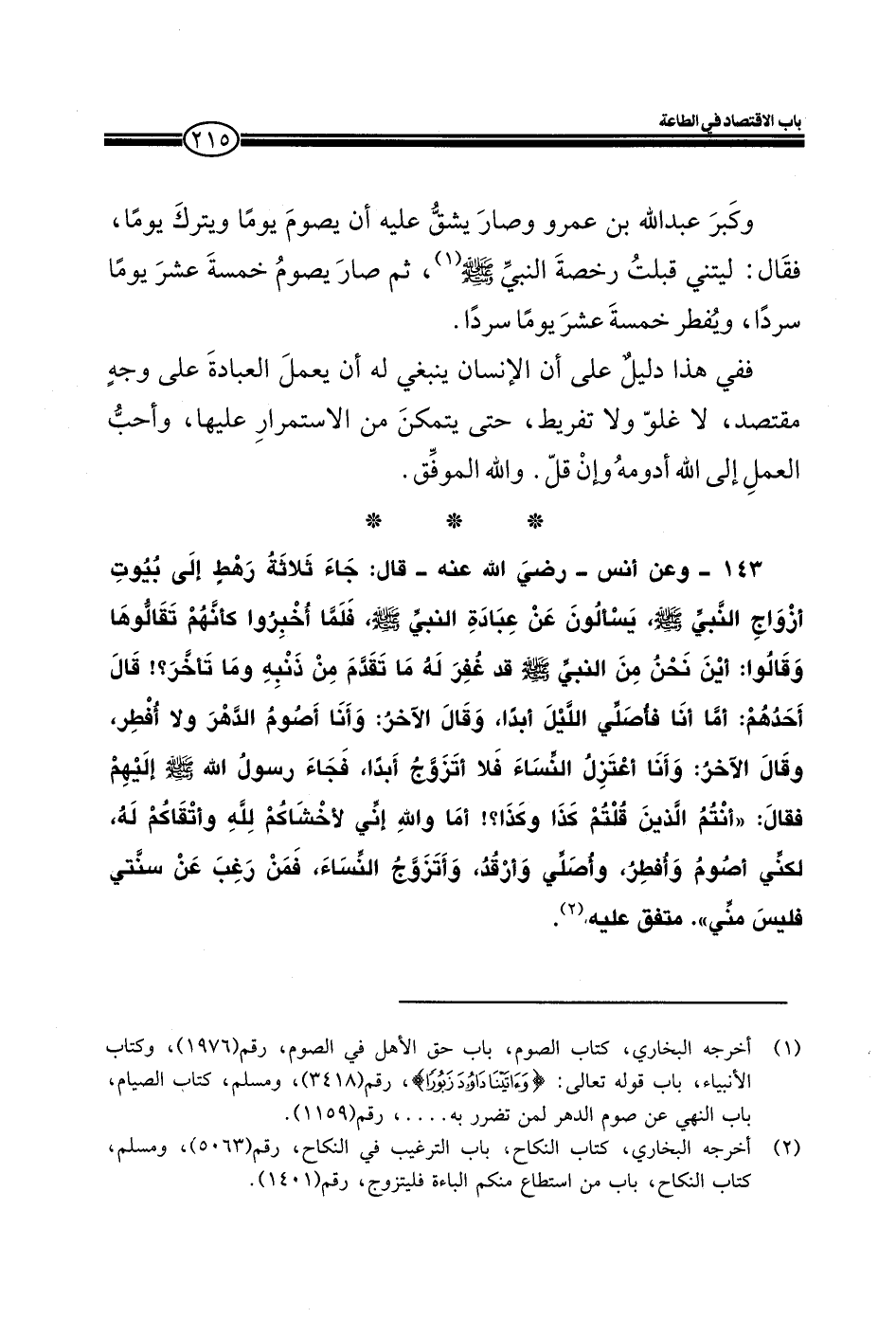 143 ـ وعن أنس ـ رضي الله عنه ـ قال: جاء ثلاثة رهط إلى بيوت أزواج النبي صلى الله عليه وسلم، يسألون عن عبادة النبي صلى الله عليه وسلم، فلما أخبروا كأنهم تقالوها وقالوا: أين نحن من النبي صلى الله عليه وسلم قد غفر له تقدم من ذنبه وما تأخر؟! قال أحدهم: أما أنا فاصلي الليل أبداً، وقال الآخر: وأنا أصوم الدهر ولا أفطر، وقال الآخر: وأنا أعتزل النساء فلا أتزوج أبداً، فجاء رسول الله صلى الله عليه وسلم إليهم فقال: (أنتم الذين قلتم كذا وكذا؟! أما والله إني لأخشاكم لله وأتقاكم له، لكني أصوم وأفطر، وأصلي وأرقد، وأتزوج النساء، فمن رغب عن سنتي فليس مني) متفق عليه.