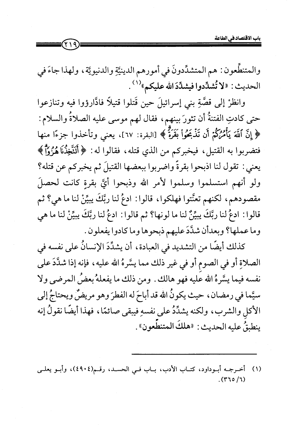 كذلك أيضاً من التشديد في العبادة، أن يشدد الإنسان على نفسه في الصلاة أو في الصوم أو في غير ذلك مما يسره الله عليه، فإنه إذا شدد على نفسه فيما يسره الله فهو هالك. ومن ذلك ما يفعله بعض المرضى ولا سيما في رمضان حي يكون الله قد اباح له الفطر وهو مريض ويحتاج إلي الأكل والشرب، ولكنه يشدد على نفسه فيبقى صائماً فهذا أيضاً نقول إنه ينطبق عليه الحديث: هلك المتنطعون.