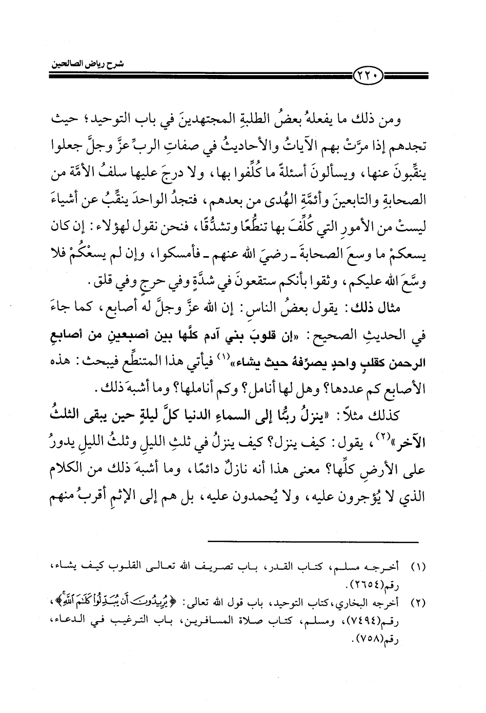 ومن ذلك ما يفعله بعض الطلبة المجتهدين في باب التوحيد؛ حيث تجدهم إذا مرت بهم الآيات والأحاديث في صفات الرب عز وجل جعلوا ينقبون عنها، ويسألون أسئلة ما كلفوا بها، ولا درج عليها سلف الأمة من الصحابة والتابعين وأئمة الهدى من بعدهم، فتجد الواحد ينقب عن أشياء ليست من الأمور التي كلف بها تنطعاً وتشقاً، فنحن نقول لهؤلاء: إن كان يسعكم ما وسع الصحابة ـ رضي الله عنهم ـ فأمسكوا، وإن لم يسعكم فلا وسع الله عليكم، وثقوا بأنكم ستقعون في شدة وفي حرج وفي قلق.