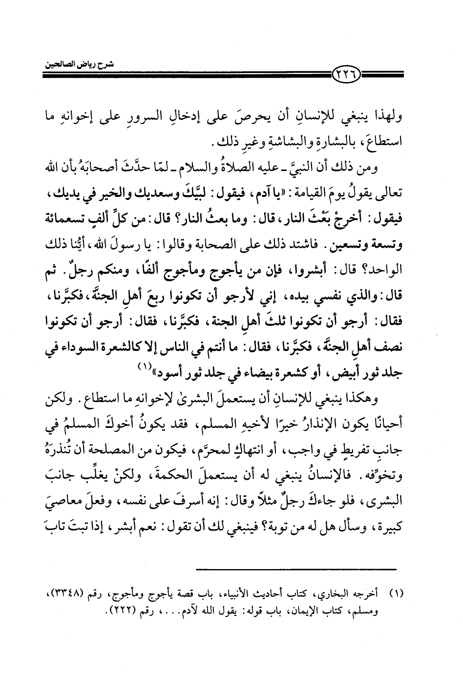 ولهذا ينبغي للإنسان أن يحرص على إدخال السرور على إخوانه ما استطاع، بالبشارة والبشاشة وغير ذلك.