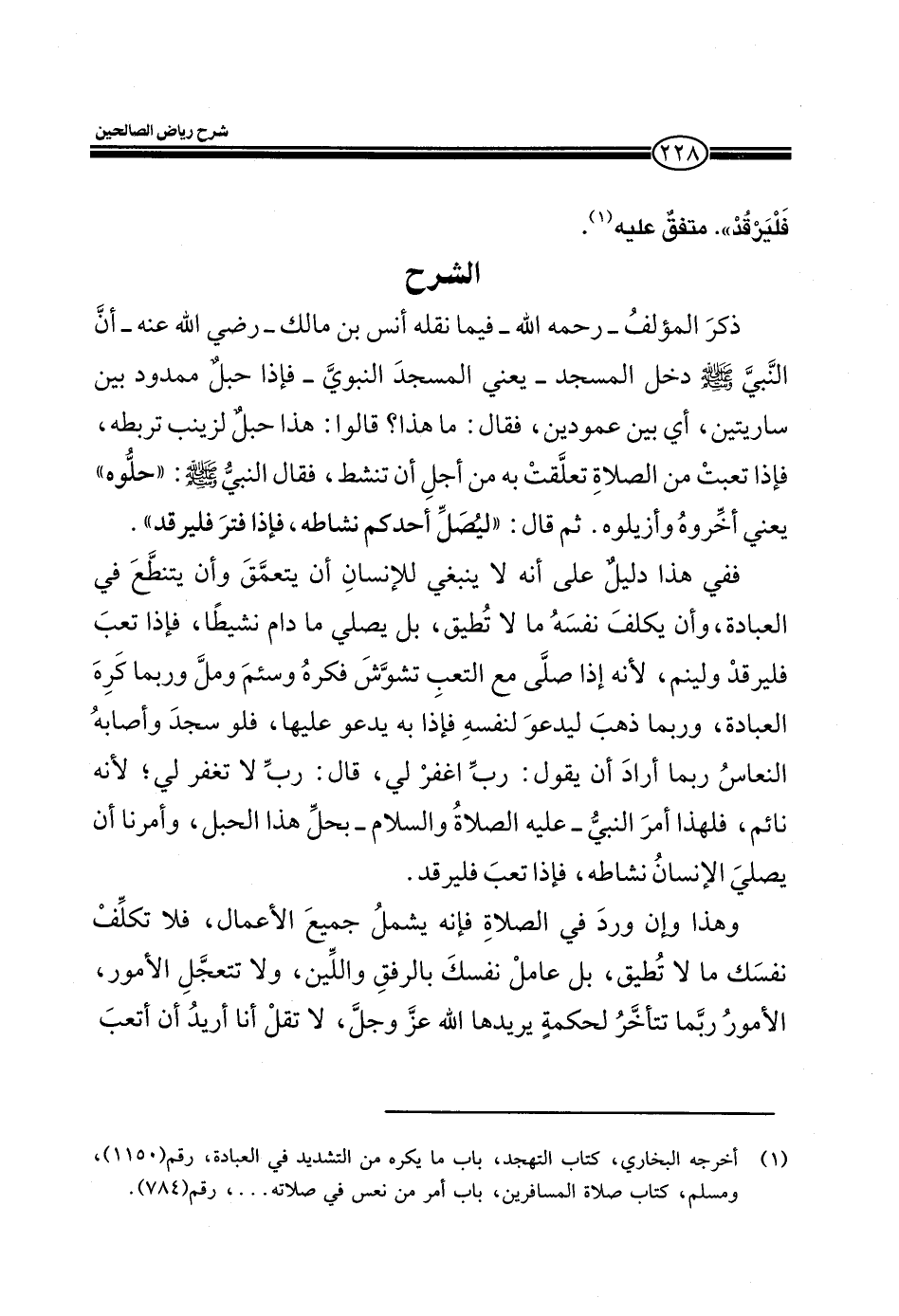 ففي هذا دليل على أنه لا ينبغي للإنسان أن يتعمق وأن يتنطع في العبادة، أن يكلف نفسه ما لا تطيق، بل يصلي ما دام نشيطاً، فإذا تعب فليرقد ولينم، لأنه إذا صلى مع التعب تشوش فكره وسئم ومل وربما كره العبادة، وربما ذهب ليدعو لنفسه فإذا به يدعو عليها، فلو سجد وأصابه النعاس ربما أراد أن يقول: رب اغفر لي، قال: رب لا تغفر لي، لأنه نائم، فلهذا أمر النبي ـ عليه الصلاة والسلام ـ بحل هذا الحبل، وأمرنا أن يصلي الإنسان نشاطه، فإذا تعب فليرقد.