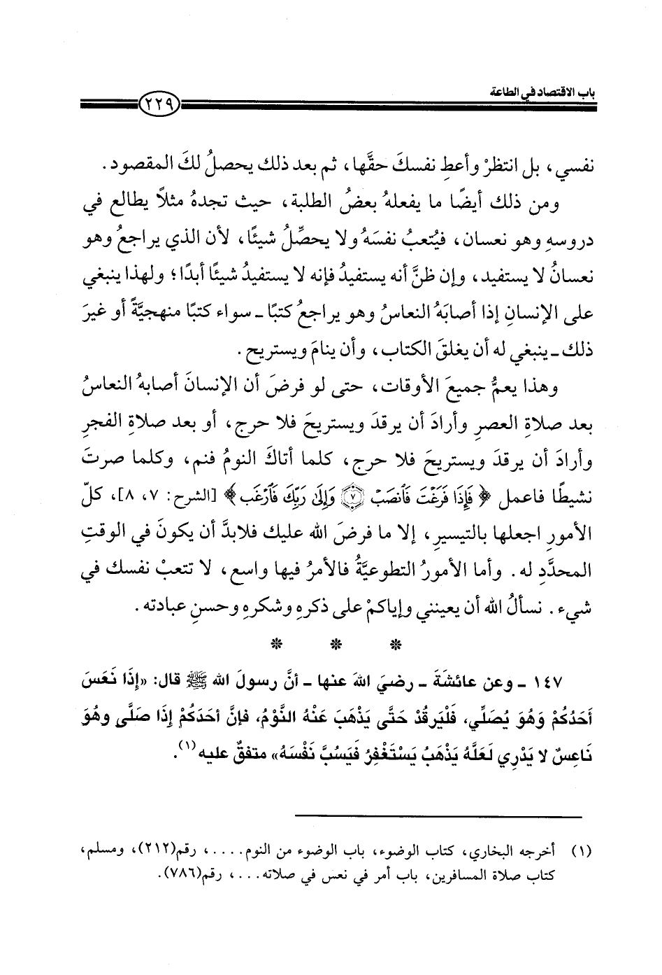 147 ـ وعن عائشة ـ رضي الله عنها ـ أن رسول الله صلى الله عليه وسلم قال: (إذا نعس أحدكم وهو يصلي، فليرقد حتى يذهب عنه النوم، فإن أحدكم إذا صلي وهو ناعس لا يدري لعله يذهب يستغفر فيسب نفسه) متفق عليه.