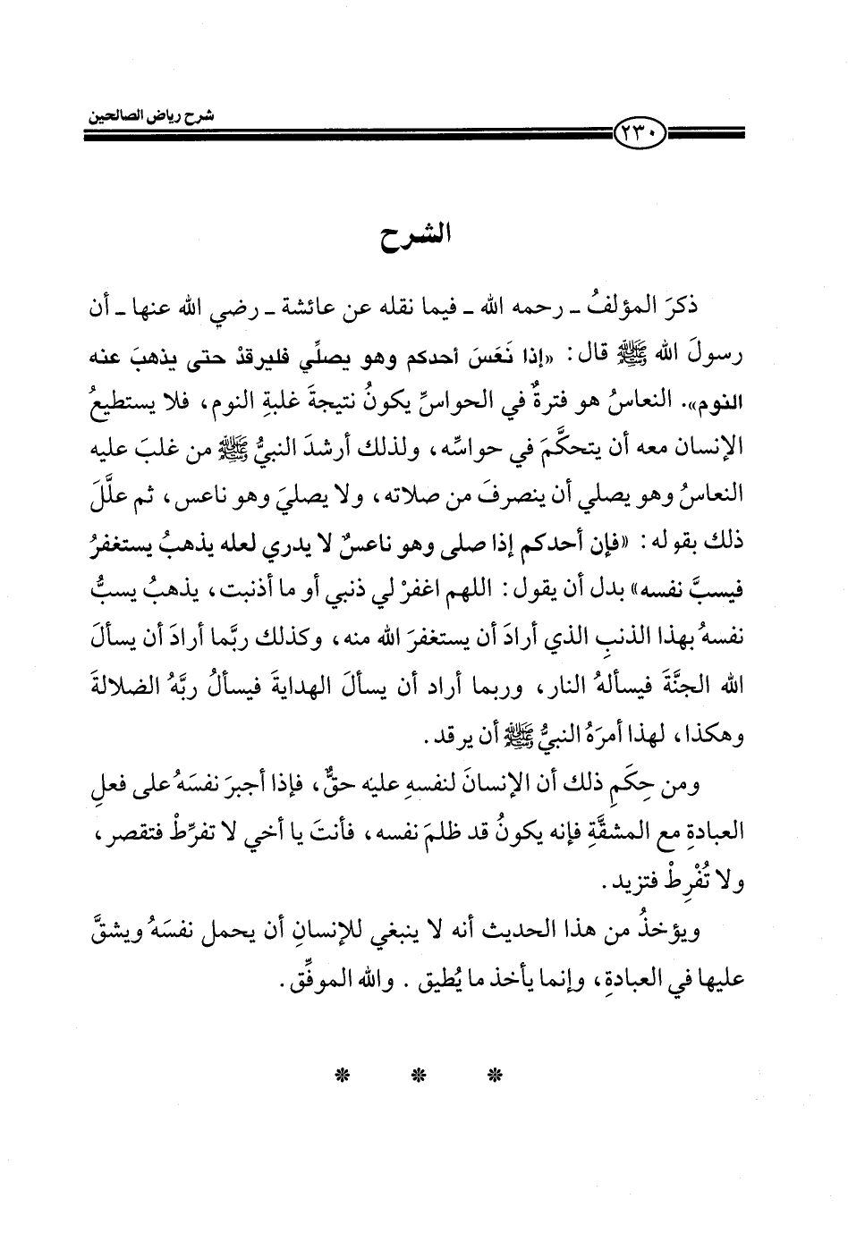 EXذكر المؤلف ـ رحمه الله ـ فيما نقله عن عائشة ـ رضي الله عنها ـ أن رسول الله صلى الله عليه وسلم قال: (إذا نعس أحدكم وهو يصلي، فليرقد حتى يذهب عنه النوم) النعاس هو فترة في الحواس يكون نتيجة غلبة النوم، فلا يستطيع الإنسان معه أن يتحكم في حواسه، ولذلك أرشد النبي صلى الله عليه وسلم من غلب عليه النعاس وهو يصلي أن ينصرف من صلاته، ولا يصلي وهو ناعس، ثم علل ذلك بقول: فإن أحدهم إذا صلى وهو ناعس لا يدري لعله يذهب يستغفر فيسيب نفسه بدل أن يقول: اللهم اغفر لي ذنبي أو ما أذنبت، يذهب يسب نفسه بهذا الذنب الذي أراد أن يستغفر الله منه، وكذلك ربما أراد أن يسال الله الجنة فيسأله النار، وربما أراد أن يسال الهداية فيسأل ربه الضلالة وهكذا، لهذا أمره النبي صلى الله عليه وسلم أن يرقد.