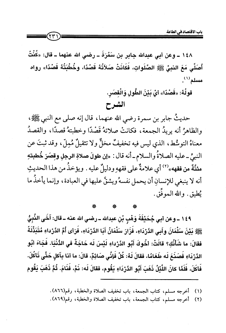 148 ـ وعن أبي عبد الله جابر بن سمرة ـ رضي الله عنهما ـ قال: كنت أصلي مع النبي صلى الله عليه وسلم الصلوات، فكانت صلاته قصداً، وخطبته قصداً) رواه مسلم.