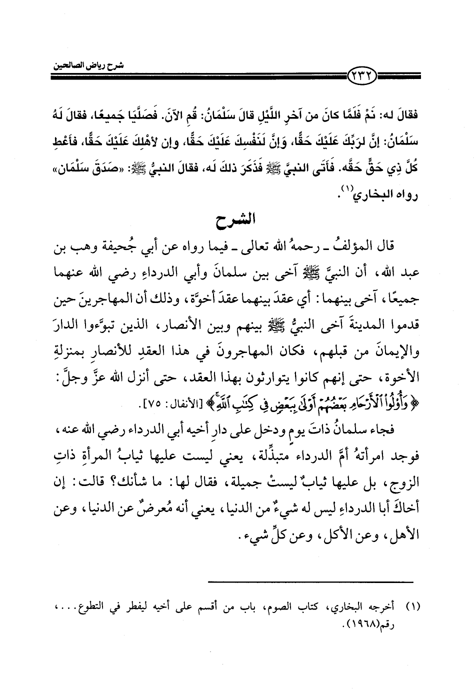 EXقال المؤلف ـ رحمه الله تعالى ـ فيما رواه عن أبي جحيفة وهب بن عبد الله، أن النبي صلى الله عليه وسلم آخى بين سلمان وأبي الدرداء رضي الله عنهما جميعاً، آخى بينهما: أي عقد بينهما عقد أخوة، وذلك أن المهاجرين حين قدموا المدينة آخى النبي صلى الله عليه وسلم بينهم وبين الأنصار، الذين تبوءوا الدار والإيمان من قبلهم، فكان المهاجرون في هذا العقد للأنصار بمنزلة الأخوة، حتى إنهم كانوا يتوارثون بهذا العقد، حتى أنزل الله عز وجل: (وَأُولُوا الْأَرْحَامِ بَعْضُهُمْ أَوْلَى بِبَعْضٍ فِي كِتَابِ اللَّهِ) (الأنفال: 75) .