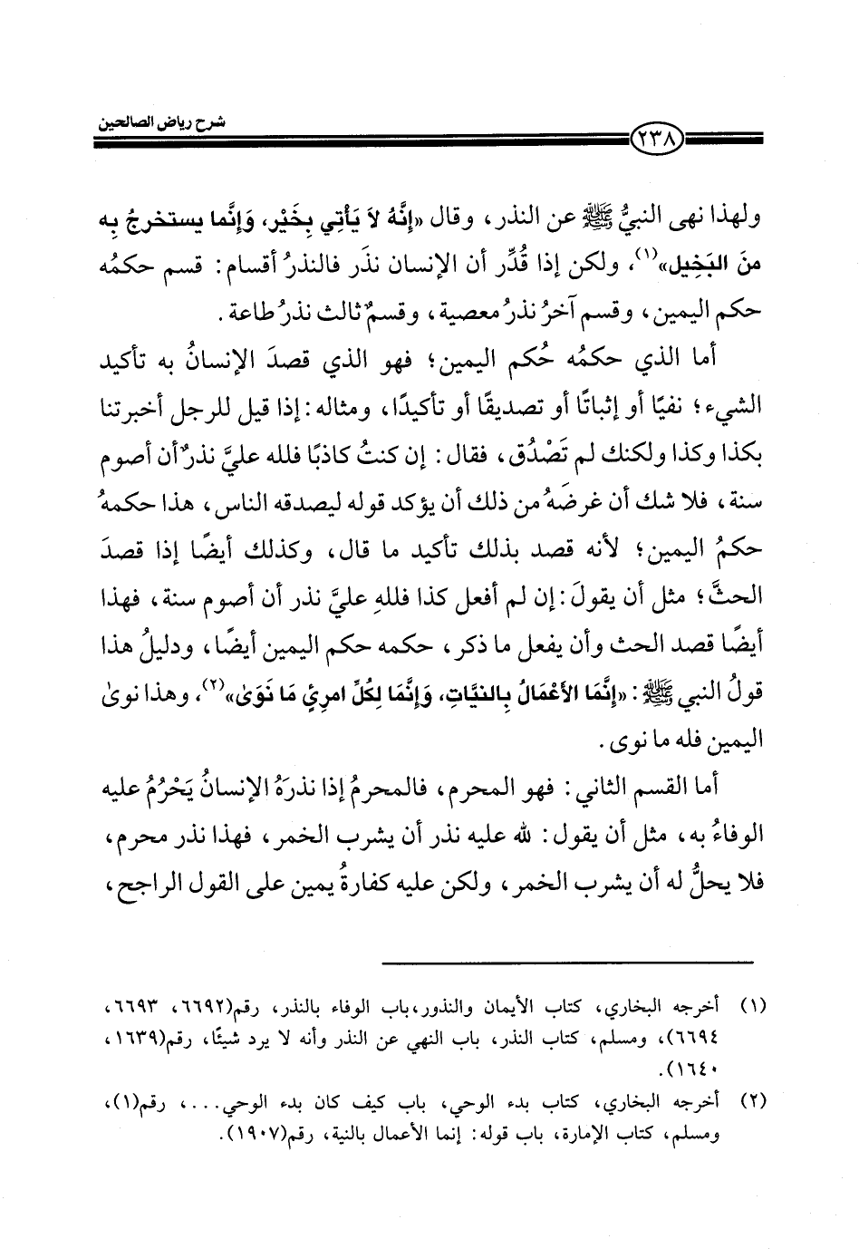 ولهذا نهى النبي صلى الله عليه وسلم عن النذر وقال (إنه لا يأتي بخير، وإنما يستخرج به من البخيل) ، ولكن إذا قدر أن الإنسان نذر فالنذر أقسام: قسم حكمه حكم اليمين، وقسم آخر نذر معصية، وقسم ثالث نذر طاعة.