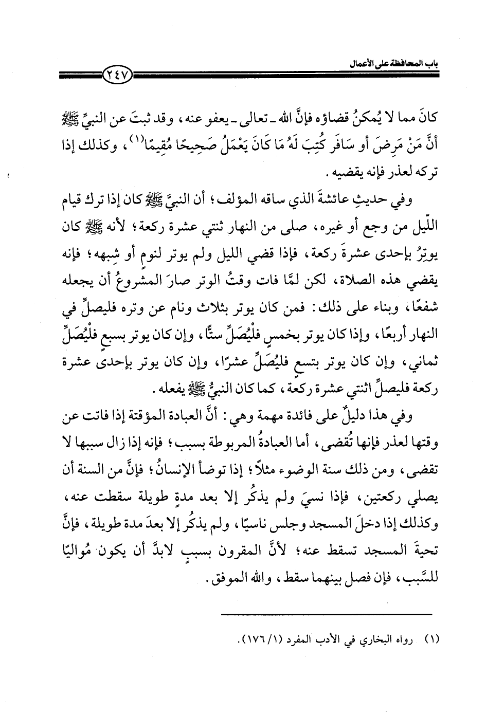 وفي حديث عائشة الذي ساقه المؤلف؛ أن النبي صلى الله عليه وسلم كان إذا ترك القيام الليل من وجع أو غيره، صلى من النهار ثنتي عشرة ركعة، لأنه صلى الله عليه وسلم كان يوتر بإحدى عشر ركعة، فإذا قضي الليل ولم يوتر لنوم أو شبهه؛ فإنه يقضي هذه الصلاة، لكن لما فات وقت الوتر صار المشروع أن يجعله شفعاً، بناء على ذلك: فمن كان يوتر بثلاث ونام عن وتره فليصل في النهار أربعاً، وإذا كان يوتر بخمس فليصل ستاً، وإن كان يوتر بسبع فليصل ثماني، وإن كان يوتر بتسع فليصل عشراً، وإن كان يوتر بإحدى عشرة ركعة فليصل اثنتي عشرة ركعة، كما كان النبي صلى الله عليه وسلم يفعله.