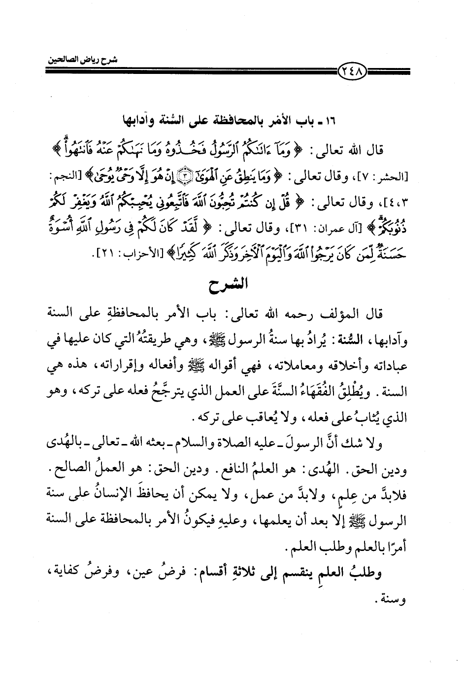 EXقال المؤلف ـ رحمه الله تعالى ـ: باب الأمر بالمحافظة على السنة وآدابها، السنة: يراد بها سنة الرسول صلى الله عليه وسلم، وهي طريقته التي كان عليها في عباداته وأخلاقه ومعاملاته، فهي أقواله صلى الله عليه وسلم وأفعاله وإقراراته، هذه هي السنة. ويطلق الفقهاء السنة على العمل الذي يترجح فعله على تركه، وهو الذي يثاب على فعله، ولا يعاقب على تركه.