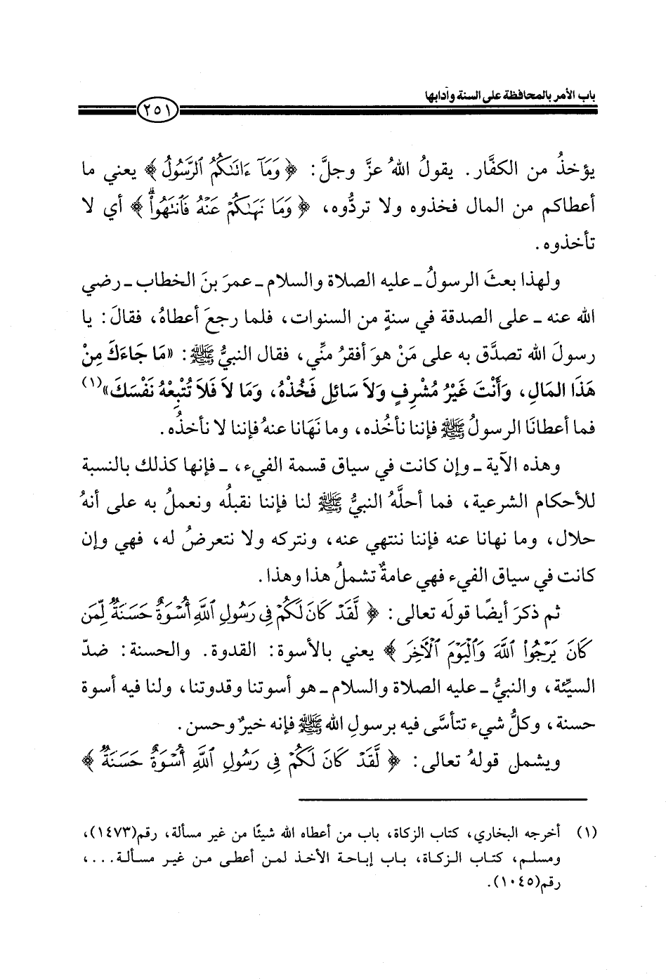 ولهذا بعث الرسول ـ عليه الصلاة والسلام ـ عمر بن الخطاب ـ رضي الله عنه ـ على الصدقة في سنة من السنوات، فلما رجع أعطاه فقال: يا رسول الله تصدق به على من هو أفقر مني، فقال النبي صلى الله عليه وسلم: (ما جاءك من هذا المال، وأنت غير مشرف ولا سائل فخذه، وما لا فلا تتبعه نفسك) فما أعطانا الرسول صلى الله عليه وسلم فإننا نأخذه، وما نهانا عنه فإننا لا نأخذه.