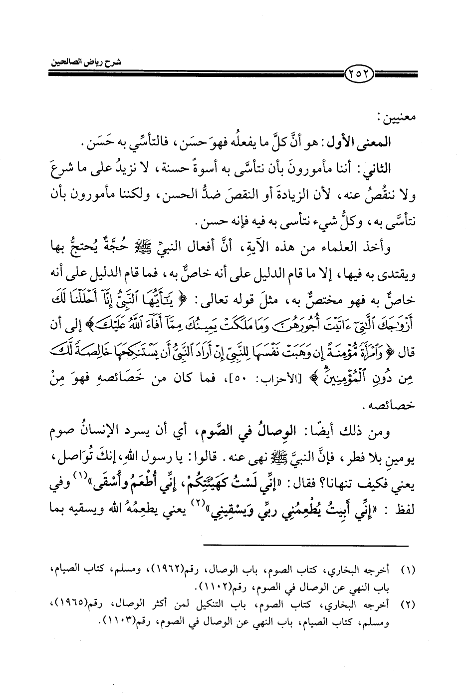 الثاني: أننا مأمورون بأن نتأسى به أسوة حسنة، لا نزيد على ما شرع ولا ننقص عنه، لأن الزيادة أو النقص ضد الحسن، ولكننا مأمورون بأن نتأسى به وكل شيء نتأسى به فيه فإنه حسن.