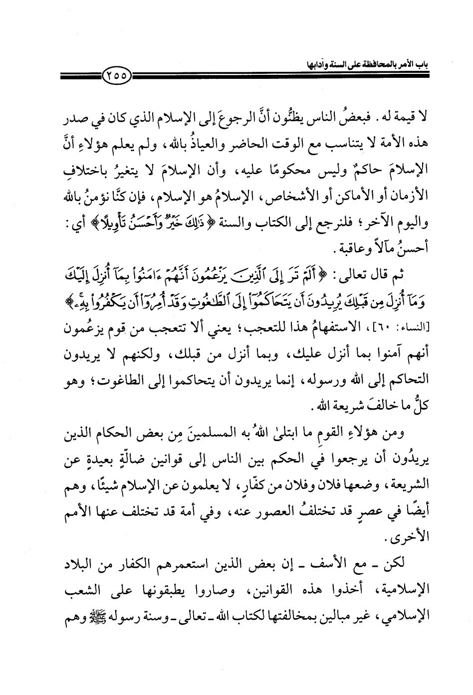 ومن هؤلاء القوم ما ابتلى الله به المسلمين من بعض الحكام الذين يريدون أن يرجعوا في الحكم بين الناس إلى قوانين ضالة بعيدة عن الشريعة، وضعها فلان وفلان من كفار، لا يعلمون عن الإسلام شيئاً، هم أيضاً في عصر قد تختلف العصور عنه، وفي أمة قد تختلف عنها الأمم الأخرى.