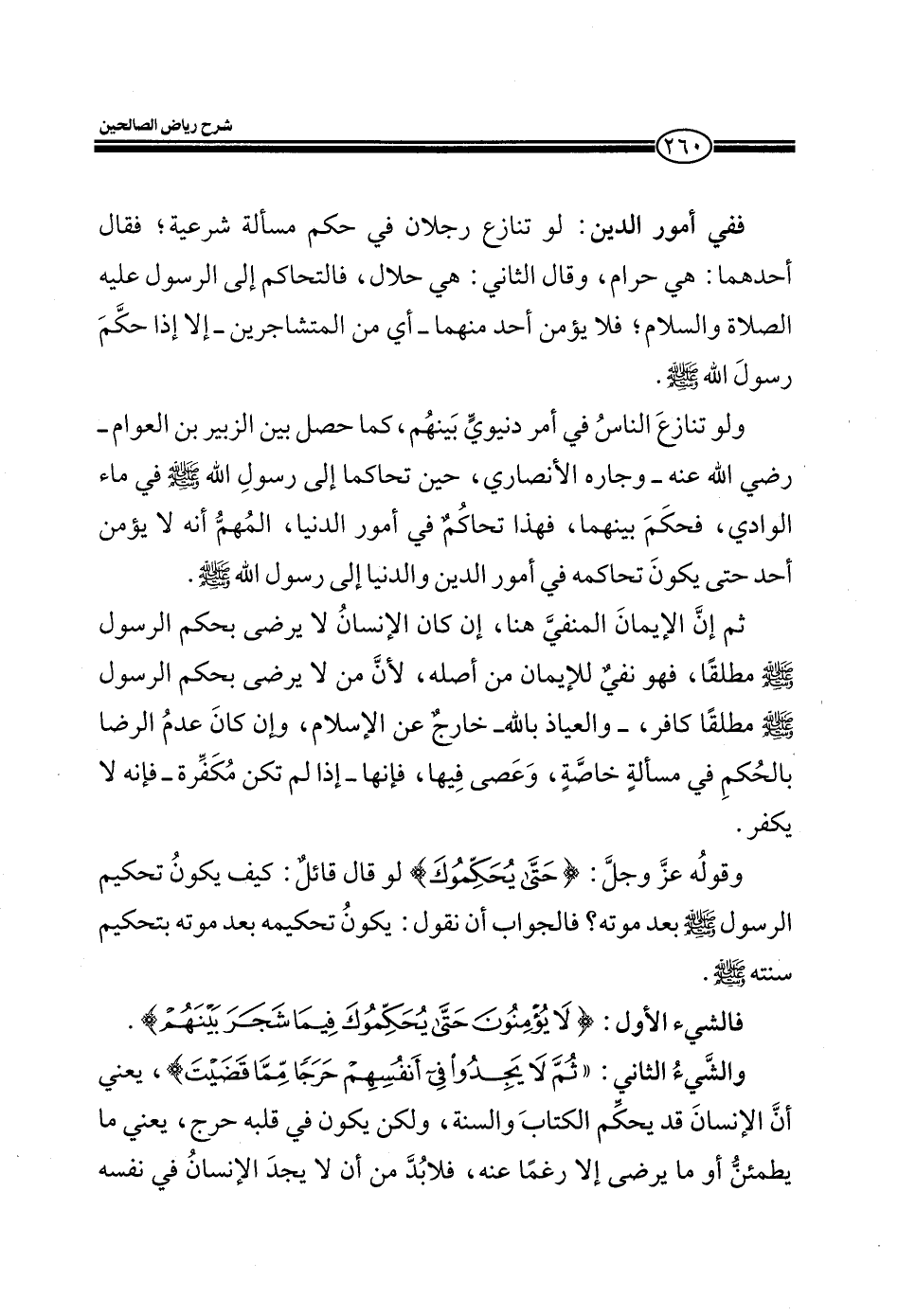 ففي أمور الدين: لو تنازع رجلان في حكم مسألة شرعية؛ فقال أحدهما: هي حرام، وقال الثاني: هي حلال، فالتحاكم إلى الرسول عليه الصلاة والسلام؛ فلا يؤمن أحد منهما ـ أي من المتشاجرين ـ إلا إذا حكم رسول الله صلى الله عليه وسلم.