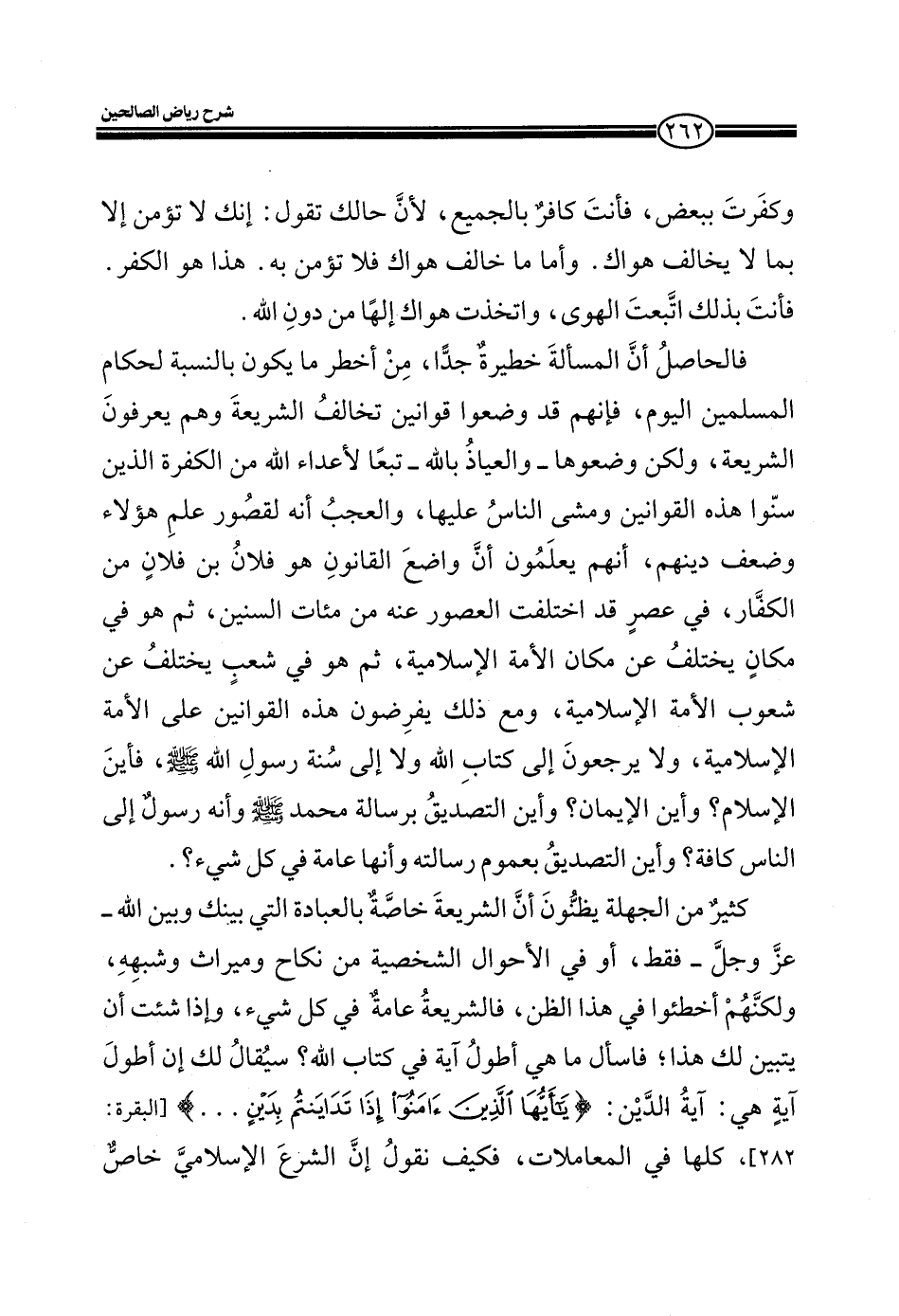 كثير من الجهلة يظنون أن الشريعة خاصة بالعبادة التي بينك وبين الله ـ عز وجل ـ فقط، أو في الأحوال الشخصية من نكاح وميراث وشبهه، ولكنهم أخطئوا في هذا الظن، فالشريعة عامة في كل شيء، وإذا شئت أن يتبين لك هذا؛ فسال ما هي أطول آية في كتاب الله؟ سيقال لك إن أطول آية هي: آيه الدين: (يَا أَيُّهَا الَّذِينَ آمَنُوا إِذَا تَدَايَنْتُمْ بِدَيْنٍ....) (البقرة: 282) كلها في المعاملات، فكيف نقول إن الشرع الإسلامي خاص