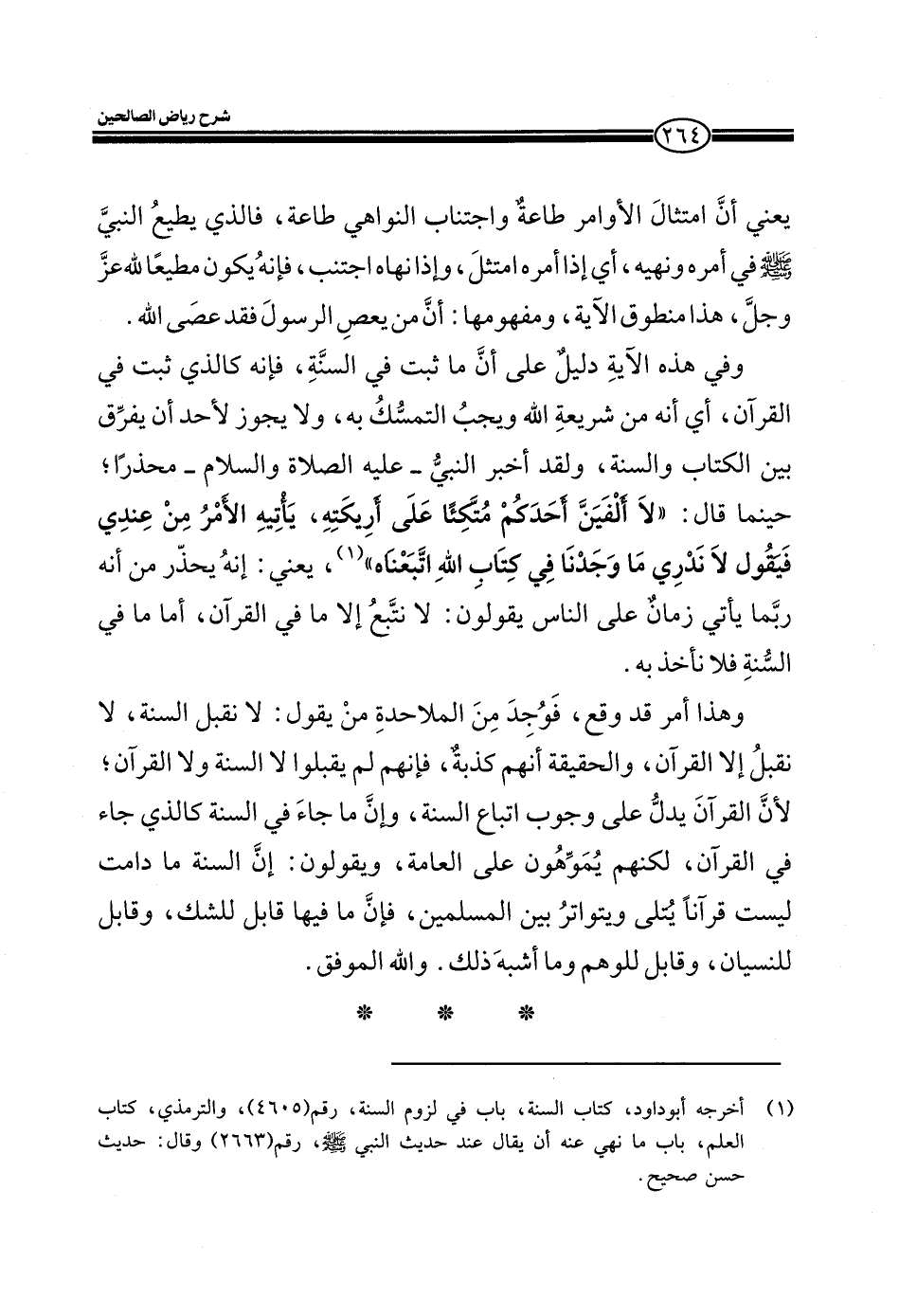 وفي هذه الآية دليل على أن ما ثبت في السنة، فإنه كالذي ثبت في القرآن، أي أنه من شريعة الله ويجب التمسك به، ولا يجوز لأحد أن يفرق بين الكتاب والسنة، ولقد أخبر النبي ـ عليه الصلاة والسلام ـ محذراً؛ حينما قال: (لا ألفين أحدكم متكئاً على أريكته، يأتيه الأمر من عندي فيقول لا ندري ما وجدنا في كتاب الله اتبعناه) ، يعني إنه يحذر من أنه ربما يأتي زمان على الناس يقولون: لا نتبع إلا ما في القرآن، أما ما في السنة فلا تأخذ به.