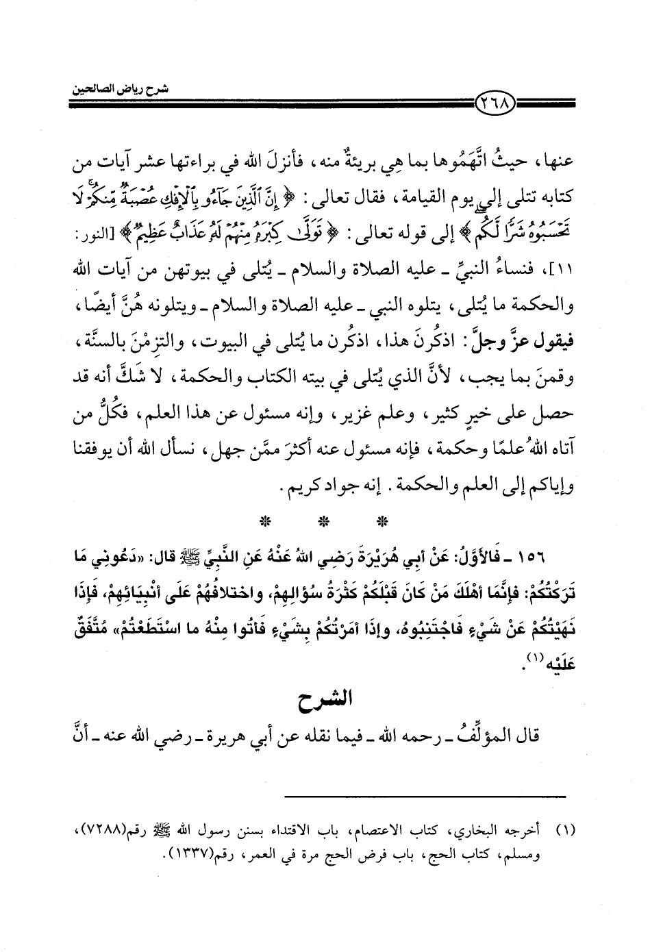 156ـ فالأول عن أبي هريرة رضي الله عنه عن النبي صلى الله عليه وسلم قال: (دعوني ما تركتكم فإنما أهلك من كان قبلكم كثرة سؤالهم، واختلافهم على أنبيائهم، فإذا نهيتكم عن شيء فاجتنبوه، وإذا أمرتكم بشيء فأتوا منه ما استطعتم) متفق عليه.