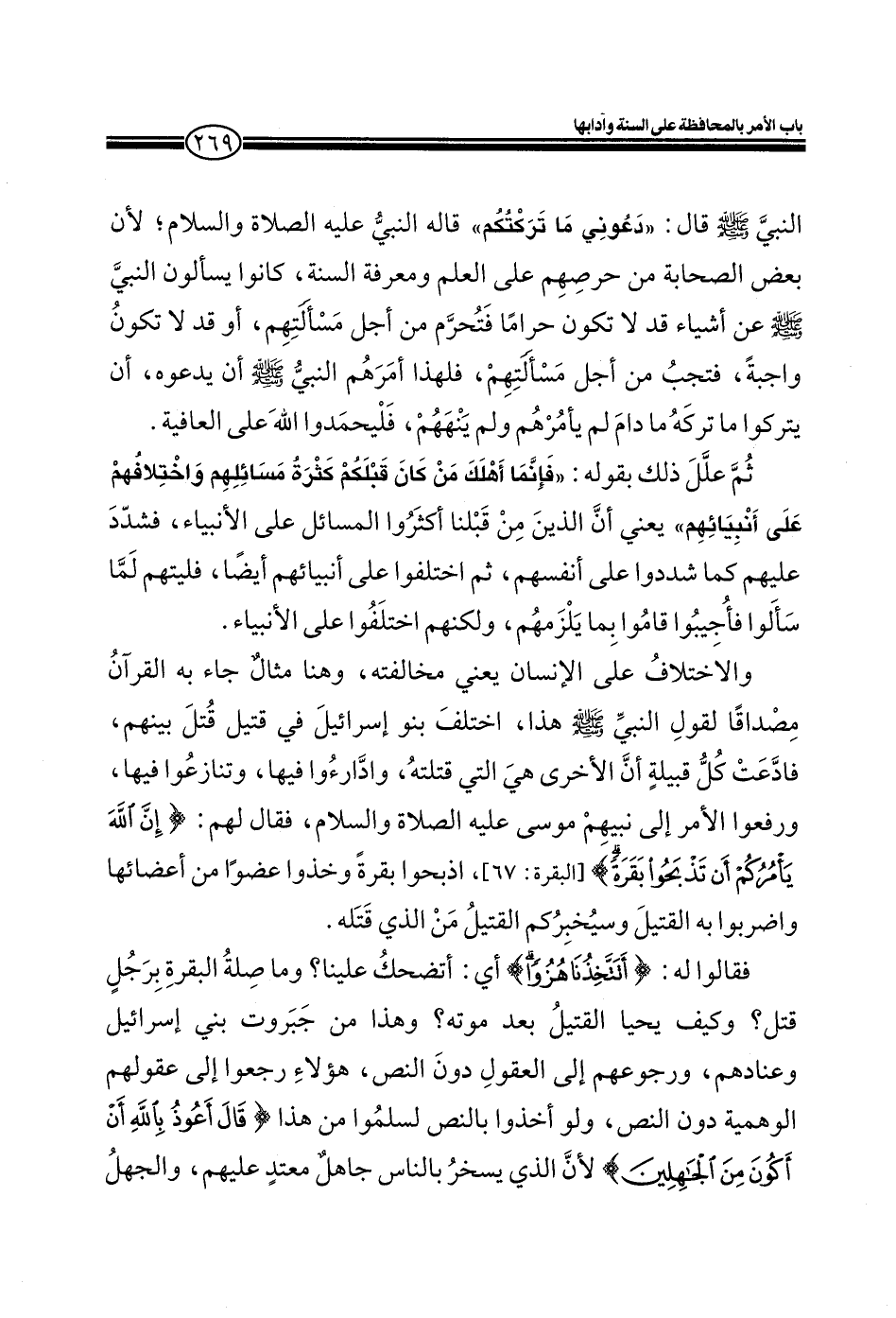 ثم علل ذلك بقوله: (فإنما أهلك من كان قبلكم كثرة سؤالهم، واختلافهم على أنبيائهم) يعني أن الذين من قبلنا أكثروا المسائل على الأنبياء، فشدد عليهم كما شددوا على أنفسهم، ثم اختلفوا على أنبيائهم أيضاً، فليتهم لما سألوا فأجيبوا قاموا بما يلزمهم، ولكنهم اختلفوا على الأنبياء.