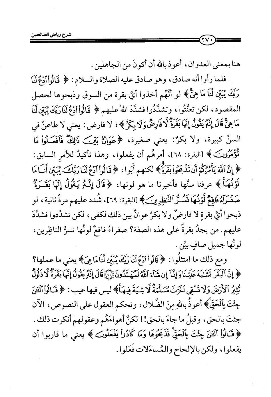 فلما رأوا أنه صادق، وهو صادق عليه الصلاة والسلام: (قَالُوا ادْعُ لَنَا رَبَّكَ يُبَيِّنْ لَنَا مَا هِيَ) لو أنهم أخذوا أي بقرة من السوق وذبحوها لحصل المقصود، لكن تعنتوا، وتشددوا فشدد الله عليهم (قَالُوا ادْعُ لَنَا رَبَّكَ يُبَيِّنْ لَنَا مَا هِيَ قَالَ إِنَّهُ يَقُولُ إِنَّهَا بَقَرَةٌ لا فَارِضٌ وَلا بِكْرٌ) ؛ لا فارض: يعني لا طاعن في السن كبيرة، ولا بكر: يعني صغيرة (عَوَانٌ بَيْنَ ذَلِكَ فَافْعَلُوا مَا تُؤْمَرُونَ) (البقرة: 68) ، أمرهم أن يفعلوا، وهذا تأكيد للأمر السابق: (إِنَّ اللَّهَ يَأْمُرُكُمْ أَنْ تَذْبَحُوا بَقَرَةً) لكنهم أبوا، (قَالُوا ادْعُ لَنَا رَبَّكَ يُبَيِّنْ لَنَا مَا لَوْنُهَا) عرفنا سنها فأخبرنا ما هو لونها، (قَالَ إِنَّهُ يَقُولُ إِنَّهَا بَقَرَةٌ صَفْرَاءُ فَاقِعٌ لَوْنُهَا تَسُرُّ النَّاظِرِينَ) (البقرة: 69) ، شدد عليهم مرة ثانية، لو ذبحوا أي بقرة لا فارض ولا بكر عوان بين ذلك لكفى، لكن تشددوا فشدد عليهم. من يجد بقرة على هذه الصفة؟ صفراء فاقع لونها تسر الناظرين، لونها جميل صاف بين.