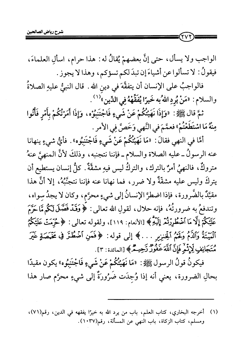 أما في النهي فقال: (ما نهيتكم عن شيءٍ فاجتنبوه) . فأي شيء ينهانا عنه الرسول ـ عليه الصلاة والسلام ـ فإننا نتجنبه، وذلك لأن المنهي عنه متروك، فالنهي أمر بالترك ليس فيه مشقة. كل إنسان يستطيع أن يترك وليس عليه مشقة ولا ضرر، فما نهانا عنه فإننا نتجنبه، إلا أن هذا مقيد بالضرورة، فإذا اضطر الإنسان إلى شيءٍ محرم، وكان لا يجد سواه، وتندفع به ضرورته، فإنه حلال لقول الله تعالى: (وَقَدْ فَصَّلَ لَكُمْ مَا حَرَّمَ عَلَيْكُمْ إِلَّا مَا اضْطُرِرْتُمْ إِلَيْه) (الأنعام: من الآية119) ، ولقوله تعالى: (حُرِّمَتْ عَلَيْكُمُ الْمَيْتَةُ وَالدَّمُ وَلَحْمُ الْخِنْزِيرِ ... ) إلى قوله: (فَمَنِ اضْطُرَّ فِي مَخْمَصَةٍ غَيْرَ مُتَجَانِفٍ لإِثْمٍ فَإِنَّ اللَّهَ غَفُورٌ رَحِيمٌ) (المائدة: 3) .